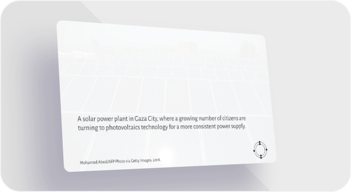 A solar power plant in Gaza City, where a growing number of citizens are turning to photovoltaics technology for a more consistent power supply. Mohamed Abed/AFP Photo via Getty Images. 2016.