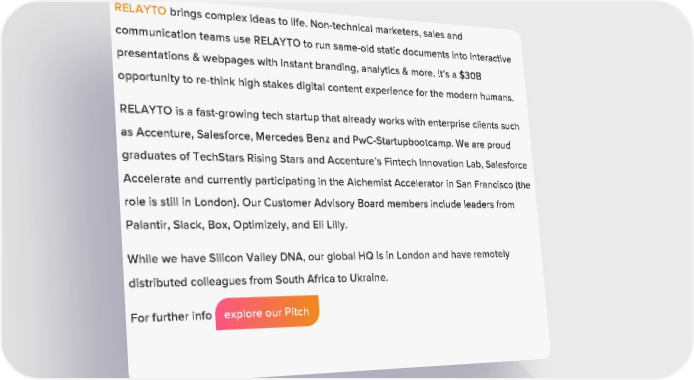 RELAYTO brings complex ideas to life. Non-technical marketers, sales and communication teams use RELAYTO to run same-old static documents into interactive presentations & webpages with instant branding, analytics & more. It’s a $30B opportunity to re-think high stakes digital content experience for the modern humans. RELAYTO is a fast-growing tech startup that already works with enterprise clients such as Accenture, Salesforce, Mercedes Benz and PwC-Startupbootcamp. We are proud graduates of TechStars Rising Stars and Accenture’s Fintech Innovation Lab, Salesforce Accelerate and currently participating in the Alchemist Accelerator in San Francisco (the role is still in London). Our Customer Advisory Board members include leaders from Palantir, Slack, Box, Optimizely, and Eli Lilly. While we have Silicon Valley DNA, our global HQ is in London and have remotely distributed colleagues from South Africa to Ukraine. For further info explore our Pitch
