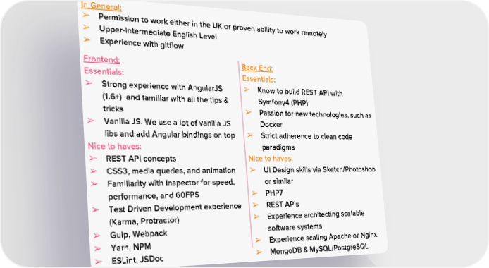 In General: ➢ Permission to work either in the UK or proven ability to work remotely ➢ Upper-Intermediate English Level ➢ Experience with gitflow Frontend: Back End: Essentials: Essentials: ➢ Strong experience with AngularJS ➢ Know to build REST API with (1.6+) and familiar with all the tips & Symfony4 (PHP) tricks ➢ Passion for new technologies, such as ➢ Vanilla JS. We use a lot of vanilla JS Docker libs and add Angular bindings on top ➢ Strict adherence to clean code Nice to haves: paradigms ➢ REST API concepts Nice to haves: ➢ CSS3, media queries, and animation ➢ UI Design skills via Sketch/Photoshop ➢ Familiarity with Inspector for speed, or similar performance, and 60FPS ➢ PHP7 ➢ Test Driven Development experience ➢ REST APIs (Karma, Protractor) ➢ Experience architecting scalable ➢ Gulp, Webpack software systems ➢ Yarn, NPM ➢ Experience scaling Apache or Nginx. ➢ ESLint, JSDoc ➢ MongoDB & MySQL/PostgreSQL