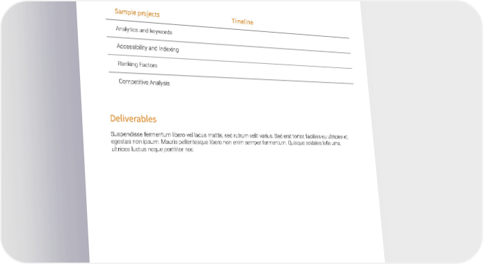 Implementation Timeline Lorem ipsum dolor sit amet, consectetur adipiscing elit. In ac tristique dui. Etiam at odio mi. Mauris pellentesque libero non enim semper fermentum. Quisque sodales felis urna, ultrices luctus neque porttitor nec. Sample projects Timeline Analytics and keywords Accessibility and Indexing Ranking Factors Competitive Analysis Deliverables Suspendisse fermentum libero vel lacus mattis, sed rutrum velit varius. Sed erat tortor, facilisis eu ultricies et, egestas non ipsum. Mauris pellentesque libero non enim semper fermentum. Quisque sodales felis urna, ultrices luctus neque porttitor nec.