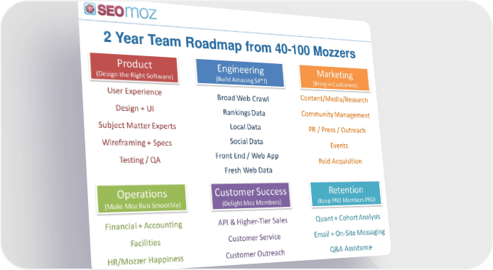 2 Year Team Roadmap from 40-100 Mozzers User Experience Product (Design the Right Software) Design + UI Subject Matter Experts Wireframing+ Specs Testing / QA PR / Press / Outreach Paid Acquisition Broad Web Crawl Rankings Data Events Engineering (Build Amazing $#*!) Marketing (Bring in Customers) Content/Media/Research Local Data Community Management Social Data Front End / Web App Fresh Web Data Operations (Make MozRun Smoothly) Customer Success (Delight MozMembers) Retention (Keep PRO Members PRO) Quant + Cohort Analysis Email + On-Site Messaging Q&A Assistance API & Higher-Tier Sales Customer Service Customer Outreach Financial + Accounting Facilities HR/MozzerHappiness