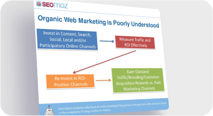 Organic Web Marketing is Poorly Understood Even those marketers who have an understanding of the process often get lost in the details or mired in the complexity of tying creative to metrics. Invest in Content, Search, Social, Local and/or Participatory Online Channels Measure Traffic and ROI Effectively Re-Invest in ROI- Positive Channels Earn Outsized Traffic/Branding/Customer Acquisition Rewards vs. Paid Marketing Channels