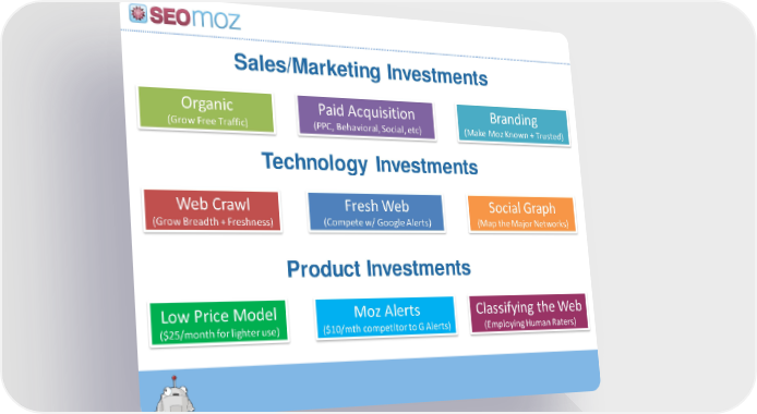 Sales/Marketing Investments Organic (Grow Free Traffic) Paid Acquisition (PPC, Behavioral, Social, etc) Branding (Make MozKnown + Trusted) Technology Investments Web Crawl (Grow Breadth + Freshness) Fresh Web (Compete w/ Google Alerts) Social Graph (Map the Major Networks) Product Investments Low Price Model ($25/month for lighter use) MozAlerts ($10/mthcompetitor to G Alerts) Classifying the Web (Employing Human Raters)
