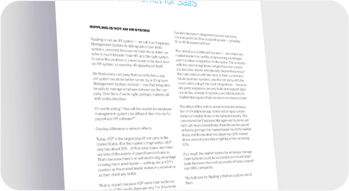 Network E昀昀ects & the ‘Supermarket for SaaS’ RIPPLING IS NOT AN HR SYSTEM But an employee management system has many more adjacencies than a payroll system — probably Rippling is not an HR system — we call it an Employee 70 or 80 thousand of them. Management System to distinguish it from HRIS This introduces a di昀昀erent dynamic — one where any systems, precisely because we think the problem we market leader has swiftly compounding advantages solve is much broader than HR, and the right system over the other competitors in the space. The company to solve this problem is a level down in the stack from with the most integrations will get the most custom- an HR system, or even the HR department itself. ers, because clients will naturally choose the product We think every company that currently has a pay- that can connect with the most of their current and roll system would be better served by an Employee future business systems, and the company with the Management System, instead — one that integrates most clients will get the most integrations — because broadly to manage employee data across the com- 3rd-party engineers can only build and support apps pany. Over time, if we’re right, perhaps markets will in a limited number of systems and will naturally let shift in this direction. market share guide their decisions on where to build. It’s worth asking: “How will the market for employee The e昀昀ect of this shift is similar to how the introduc- management systems be di昀昀erent than the one for tion of smartphone app stores led to rapid concen- payroll and HR software?” tration of market share in the handset industry. This new market for Employee Management Systems will One key di昀昀erence is network e昀昀ects. be much more concentrated than the one for payroll software: perhaps the market leader has 60% market Today, ADP is the largest payroll company in the share, and the number two player has 30% market United States. But the market is fragmented. ADP share, and everyone else is 昀椀ghting of the remaining only has about 15% - 20% market share, and there 10%. are tens of thousands of payroll service bureaus. As a result, the market leaders for employee manage- That’s because there’s no self-reinforcing advantage ment systems could be successful on a much larger to being the market leader — nothing about ADP’s scale than even the most successful of today’s payroll position as the market leader makes my experience and HRIS companies. as their client any better. That is, in part, because ADP views their world nar- The bull case for Rippling is that we could be one of rowly. In ADP’s world, there are only 7 or 8 systems them. that abutt payroll and HRIS — things like time track- ing, performance management, bene昀椀ts administra- tion, and retirement. 11 Rippling Memo