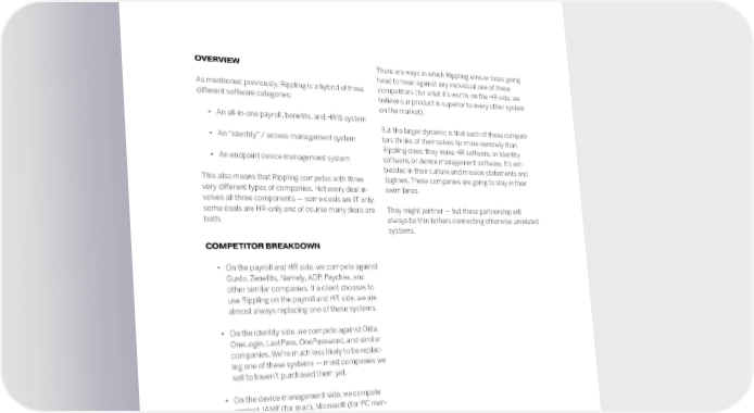 Competition OVERVIEW There are ways in which Rippling wins or loses going head to head against any individual one of these As mentioned previously, Rippling is a hybrid of three competitors (for what it’s worth, on the HR side, we di昀昀erent software categories: believe our product is superior to every other system on the market). • An all-in-one payroll, bene昀椀ts, and HRIS system But the larger dynamic is that each of these competi- • An “identity” / access management system tors thinks of themselves far more narrowly than Rippling does: they make HR software, or Identity • An endpoint device management system software, or device management software. It’s em- bedded in their culture and mission statements and This also means that Rippling competes with three taglines. These companies are going to stay in their very di昀昀erent types of companies. Not every deal in- swim lanes. volves all three components — some deals are IT only, some deals are HR-only and of course many deals are They might partner — but these partnership will both. always be thin tethers connecting otherwise unrelated systems. COMPETITOR BREAKDOWN • On the payroll and HR side, we compete against Gusto, Zene昀椀ts, Namely, ADP, Paychex, and other similar companies. If a client chooses to use Rippling on the payroll and HR side, we are almost always replacing one of these systems. • On the identity side, we compete against Okta, OneLogin, LastPass, OnePassword, and similar companies. We’re much less likely to be replac- ing one of these systems — most companies we sell to haven’t purchased them yet. • On the device management side, we compete against JAMF (for mac), Microsoft (for PC man- agement), and a few newer, but smaller, com- petitors. As with Identity systems, we’re much less likely to be replacing one of these systems — most companies we sell to haven’t purchased them yet. 7 Rippling Memo
