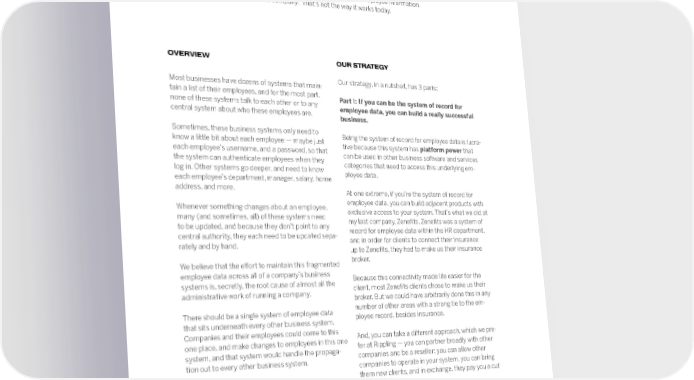 Introduction Rippling’s premise is that businesses should have a single system for employee information across every department within the company. That’s not the way it works today. OVERVIEW OUR STRATEGY Most businesses have dozens of systems that main- Our strategy, in a nutshell, has 3 parts: tain a list of their employees, and for the most part, none of these systems talk to each other or to any Part I: If you can be the system of record for central system about who these employees are. employee data, you can build a really successful business. Sometimes, these business systems only need to know a little bit about each employee — maybe just Being the system of record for employee data is lucra- each employee’s username, and a password, so that tive because this system has platform power that the system can authenticate employees when they can be used in other business software and services log in. Other systems go deeper, and need to know categories that need to access this underlying em- each employee’s department, manager, salary, home ployee data. address, and more. At one extreme, if you’re the system of record for employee data, you can build adjacent products with Whenever something changes about an employee, exclusive access to your system. That’s what we did at many (and sometimes, all) of these systems need my last company, Zene昀椀ts. Zene昀椀ts was a system of to be updated, and because they don’t point to any record for employee data within the HR department, central authority, they each need to be updated sepa- and in order for clients to connect their insurance rately and by hand. up to Zene昀椀ts, they had to make us their insurance We believe that the e昀昀ort to maintain this fragmented broker. employee data across all of a company’s business Because this connectivity made life easier for the systems is, secretly, the root cause of almost all the client, most Zene昀椀ts clients chose to make us their administrative work of running a company. broker. But we could have arbitrarily done this in any There should be a single system of employee data number of other areas with a strong tie to the em- that sits underneath every other business system. ployee record, besides insurance. Companies and their employees could come to this And, you can take a di昀昀erent approach, which we pre- one place, and make changes to employees in this one fer at Rippling — you can partner broadly with other system, and that system would handle the propaga- companies and be a reseller: you can allow other tion out to every other business system. companies to operate in your system, you can bring That’s what Rippling is, and that’s what we do. them new clients, and in exchange, they pay you a cut of their revenue. This belief — that the system of record for employee data is valuable — is the least unique, and probably the least controversial, part of our strategy. 2 Rippling Memo