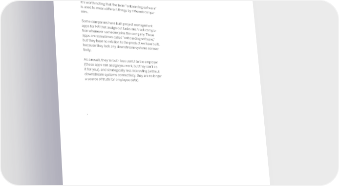 This means you need to have tentacles into all of these di昀昀erent departments and functional areas, and all the di昀昀erent 3rd party systems they use. If you build your software for one particular buyer or depart- ment, you will eventually lose to the company that solves the whole problem. Onboarding Sidebar It’s worth noting that the term “onboarding software” is used to mean di昀昀erent things by di昀昀erent compa- nies. Some companies have built project management apps for HR that assign out tasks and track comple- tion whenever someone joins the company. These apps are sometimes called “onboarding software,” but they bear no relation to the product we have built, because they lack any downstream systems connec- tivity. As a result, they’re both less useful to the employer (these apps can assign you work, but they can’t do it for you), and strategically less interesting (without downstream systems connectivity, they are no longer a source of truth for employee data). . 4 Rippling Memo