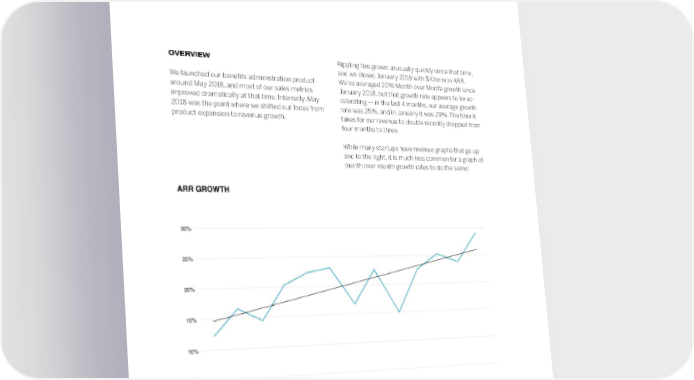 Performance to Date OVERVIEW Rippling has grown unusually quickly since that time, and we closed January 2019 with $XXmm in ARR. We launched our bene昀椀ts administration product We’ve averaged 20% Month over Month growth since around May 2018, and most of our sales metrics January 2018, but that growth rate appears to be ac- improved dramatically at that time. Internally, May celerating — in the last 4 months, our average growth 2018 was the point where we shifted our focus from rate was 25%, and in January it was 29%. The time it product expansion to revenue growth. takes for our revenue to double recently dropped from four months to three. While many startups have revenue graphs that go up and to the right, it is much less common for a graph of month over month growth rates to do the same: 8 Rippling Memo