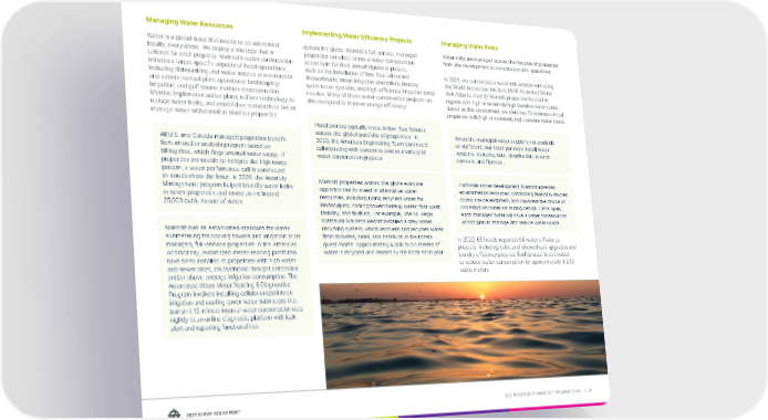 2021 SERVE 360 REPORT ESG PROGRESS AT MARRIOTT INTERNATIONAL → 29 Managing Water Resources Water is a global issue that needs to be addressed locally, everywhere. We deploy a strategy that is tailored for each property. Marriott’s water conservation initiatives target specific aspects of hotel operations, including dishwashing and water service at restaurants and events; central plant operations; landscaping/ irrigation; and golf course maintenance/operation. Marriott implements action plans, utilizes technology to reduce water leaks, and establishes standards to better manage water withdrawal at Marriott properties. All U.S. and Canada managed properties benefit from an outlier analysis program based on billing data, which flags unusual water usage. If properties are unable to mitigate the high usage pattern, a water performance call is conducted to troubleshoot the issue. In 2020, the Anomaly Management program helped identify water leaks at seven properties and saved an estimated 25,000 cubic meters of water. Marriott has an established standard for water submetering for cooling towers and irrigation at its managed, full-service properties in the Americas. Additionally, automated meter-reading platforms have been installed at properties with high water and sewer rates, acute/chronic drought conditions and/or above-average irrigation consumption. The Automated Water Meter Reading & Diagnostics Program involves installing cellular endpoints on irrigation and cooling tower water submeters that transmit 15-minute interval water consumption data nightly to an online diagnostic platform with leak alert and reporting functionalities. Implementing Water Efficiency Projects Across the globe, Marriott's full-service, managed properties can elect to use a water conservation action item for their annual signature project, such as the installation of low-flow toilets and showerheads, smart irrigation controllers, laundry water reuse systems, and high-efficiency irrigation spray nozzles. Many of these water conservation projects are also designed to improve energy efficiency. Hotel owners typically invest in low-flow fixtures across the global portfolio of properties. In 2020, the Americas Engineering Team continued collaborating with owners to assess a variety of water conservation projects. Marriott properties across the globe evaluate opportunities to invest in alternative water resources, including using recycled water for landscaping, cooling tower makeup water, first wash laundry, and flushing. For example, The St. Regis Mardavall Mallorca Resort installed a grey water recycling system, which recovers and recycles water from showers, sinks, and bathtubs in the hotel’s guest rooms. Approximately 4,000 cubic meters of water is recycled and reused by the hotel each year. Managing Water Risks Water risks are managed across the lifecycle of properties, from site development to construction and operations. In 2021, we conducted a water risk assessment using the World Resources Institute (WRI) Aqueduct Water Risk Atlas to identify Marriott properties located in regions with high or extremely high baseline water stress. Based on this assessment, we identified 15 business critical properties with high or extremely high baseline water stress. When the municipal water supply is not available or sufficient, our hotel partners install water systems, including bore, desalination, reverse osmosis, and filtration. For hotels under development, Marriott assesses environmental resources, conducting feasibility studies during site development, and considers the choice of construction materials during design. Once open, each managed hotel will have a water conservation action plan to manage and reduce water usage. In 2020, 66 hotels reported 68 water efficiency projects, including toilet and showerhead upgrades and laundry efficiency projects. Each project is estimated to reduce water consumption by approximately 8,233 cubic meters.