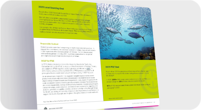 2021 SERVE 360 REPORT ESG PROGRESS AT MARRIOTT INTERNATIONAL → 34 Responsible Seafood Marriott remains committed to improving our seafood procurement practices. To support this commitment, we continued to invest in Fishery Improvement Projects (FIPs) to promote effective management of fisheries. This includes engaging with external partners including WWF to address overexploitation of species and improving bycatch handling training to local fishers. MSAP for FF&E In 2013, Marriott International joined the Hospitality Sustainable Purchasing Consortium, led by MindClick, to create an annual assessment of furniture, fixtures, and equipment (FF&E) suppliers and their products, now known as MSAP . In 2015, Marriott announced that by 2025, 95% of FF&E products specified for all prototypical brands would need to reach the highest rating in MSAP (Leader). On an annual basis, Marriott’s FF&E suppliers complete rigorous survey-based product evaluations with MindClick-a global leader in environmental and social impact ratings of manufacturers and their products. Every aspect of a product’s life cycle is evaluated based on leading globally accepted standards for environmental and social responsibility. Ratings address healthy materials, manufacturing footprint, carbon emissions, waste reduction, and fair labor and human rights. Reporting and analytics, provided to suppliers, Marriott, and now to design teams through Design for Health, are driving the selection of products and improvement in performance to support the health of people and the planet throughout Marriott’s hotels worldwide. Right: Tuna, National Marine Park Bonaire (© Casper Douma / WWF) 2025 FF&E Goal As part of our 2025 Sustainability and Social Impact Goals, Marriott aims to ensure that the top 10 FF&E product categories sourced are in the top tier of MSAP. In 2020, 3,800+ FF&E products were evaluated across the top FF&E product categories. 38% of these products scored in the top tier. 94% of FF&E was purchased from suppliers that reduce, reuse, or recycle packaging* in 2020. * Based on North American suppliers. 2025 Local Sourcing Goal As part of our 2025 Sustainability and Social Impact Goals, Marriott aims to locally source 50% of produce by 2025. Marriott plans to establish companywide local sourcing guidance to begin tracking toward our Serve 360 Goal. In 2020, Marriott hotels continued to buy local products within their regions to support creative and innovative culinary programs. For example, the JW Marriott Cancun Resort & Spa sources local corn from suppliers from the Peninsula de Yucatan region. This not only helps ensure a quality product, but also supports the local economy.