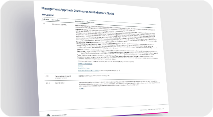 ESG PROGRESS AT MARRIOTT INTERNATIONAL → 71 ESEG PROAR TMS ORINOL Management Approach Disclosures and Indicators: Social EMPLOYMENT Indicator Description Response and / or References 401 Management approach Policies and Procedures: Fair policies and procedures, including our Global Employment Principles, are in place to protect associates’ rights, promote safe and respectful working conditions, and promote positive relationships between labor and management. Engagement Survey: Associates globally in all managed hotels, CECs, and corporate offices participated in the 2019 Associate Engagement Survey to share their feedback on their work environment and the company. Survey results are used to drive improvements at all levels, enabling Marriott to innovate and better serve associates and customers. The Associate Engagement Survey is also used to assess our sustainability and social impact programs. Our 2019 Associate Engagement Survey results indicated that 89% of associates were proud of the company’s commitment to operate sustainably (e.g., reducing our waste, water, and energy usage). In addition, 91% indicated they were proud of the company’s commitment to making a positive social impact (e.g., associate volunteerism, advancing human rights, disaster relief). We hold managers accountable for sharing survey results, conducting feedback sessions, and creating action plans to deliver continued improvement. Longstanding, Robust Employee Assistance and Work/Life Resources: Nearly 30 years ago, Marriott launched a groundbreaking resource and referral service to meet the specific needs of hourly associates in the U.S. who might not be well served by a traditional employee assistance program. Today, we continue to offer ARL, “Assistance and Resources for Life,” providing all U.S. managed associates and their families 24/7 access to consultations, resources, and referrals for virtually any work or life need. TakeCare: TakeCare is a branded collection of resources helping to fuel our culture and commitment to wellbeing and improve business performance. We engage and support managed hotels, CECs, and corporate associates through TakeCare, ensuring that our people-first culture is vibrant, personal, and relevant. TakeCare inspires associates to live our core values and bring the best of Marriott to the world. It is the foundation to our culture. Today, TakeCare has evolved from its roots in physical wellness to become that and so much more. TakeCare has helped sustain our culture throughout the global pandemic, as our managers care for their teams and associates continue to rise to the occasion to take care of each other, our customers, and local communities during the most difficult of times. 2021 Serve 360 Report (“Company Overview”, p. 6 and “Global Diversity, Equity, and Inclusion”, p. 36) Awards and Recognition Careers Heart of the House Principles of Responsible Business (“Global Employment Principles”, p. 2) 401-1 New employee hires and employee turnover 2021 Serve 360 Report (“Performance Tables”, p. 59) 401-3 Parental leave Marriott offers paid parental leave in the U.S. that includes eight fully paid weeks for birth and adoptive moms and dads. Full-time and part-time associates, who work a minimum number of hours, are eligible. Birth moms will continue to receive an additional seven weeks of partial pay for a total of 15 weeks of leave benefits. We provide financial assistance to help with adoption fees of up to $12,000. Careers