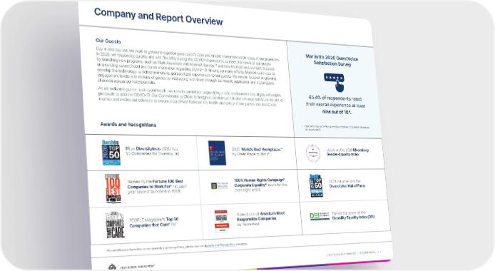 2021 SERVE 360 REPORT ESG PROGRESS AT MARRIOTT INTERNATIONAL → 7 Our Guests Day in and day out, we work to generate superior guest satisfaction and enable more memorable stays at our properties. In 2020, we responded quickly and with flexibility during the COVID-19 pandemic to meet the needs of our guests by launching new programs, such as Work Anywhere with Marriott Bonvoy,™ and new Marriott web content, focused on providing current hotel and travel information regarding COVID-19. Among our many efforts, Marriott continues to develop the technology to deliver immersive, personalized experiences to our guests. We remain focused on growing engagement levels with millions of guests by interacting with them through our mobile application and digital guest channels across our hotel portfolio. As we welcome guests back to our hotels, we remain committed to providing a safe environment that aligns with expert protocols to address COVID-19. Our Commitment to Clean is designed to minimize risk and enhance safety, as we aim to monitor and evolve our solutions to ensure a continued focus on the health and safety of our guests and associates. Awards and Recognitions Company and Report Overview 65.4% of respondents rated their overall experience at least nine out of 10 *. Marriott’s 2020 GuestVoice Satisfaction Survey For additional information on our awards and recognitions, please see our Awards and Recognitions webpage. * Approximately one in five queried guests have responded. All brands are represented. #1 on DiversityInc’s 2020 Top 50 Companies for Diversity list 2020 World’s Best Workplaces ™ by Great Place to Work ® Listed on the 2021 Bloomberg Gender-Equality Index Named to the Fortune 100 Best Companies to Work For ® list each year since it launched in 1998 100% Human Rights Campaign ® Corporate Equality* score for the past eight years 2021 inductee into the DiversityInc Hall of Fame PEOPLE Magazine's Top 50 Companies that Care ® list Named one of America’s Most Responsible Companies by Newsweek Earned top score on the Disability Equality Index (DEI)