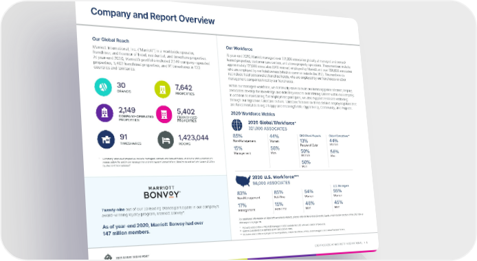 2021 SERVE 360 REPORT ESG PROGRESS AT MARRIOTT INTERNATIONAL → 6 Company and Report Overview Twenty-nine out of our 30 leading brands participate in our company’s award-winning loyalty program, Marriott Bonvoy ® . As of year-end 2020, Marriott Bonvoy had over 147 million members. 30 BRANDS 2,149 COMPANYOPERATED PROPERTIES* 5,402 FRANCHISED PROPERTIES 1,423,044 ROOMS 91 TIMESHARES 7,642 PROPERTIES * Company-operated properties include managed, owned, and leased hotels, and home and co ndominium communities for which we manage the related owners’ associations. Metrics do not include Homes & Villas by Marriott International ® . Our Global Reach Marriott International, Inc. (“Marriott”) is a worldwide operator, franchisor, and licensor of hotel, residential, and timeshare properties. At year-end 2020, Marriott’s portfolio included 2,149 company-operated properties, 5,402 franchised properties, and 91 timeshares in 133 countries and territories. Our Workforce At year-end 2020, Marriott managed over 321,000 associates globally at managed and owned/ leased properties, customer care centers, and above-property operations. These numbers include approximately 121,000 associates (54% women) employed by Marriott and over 200,000 associates who are employed by our hotel owners (which is common outside the U.S.). The numbers do not include hotel personnel at franchise hotels, who are employed by our franchisees or other management companies hired by our franchisees. Within our managed workforce, we continually strive to build our internal pipeline of talent, helping associates develop the knowledge and skills they need to build lifelong careers within our company. In addition to maintaining fair employment principles, we also support associate wellbeing through our signature TakeCare culture. TakeCare focuses on three distinct employee pillars that are fundamental to living a happy and meaningful life: Opportunity, Community, and Purpose. 2020 Workforce Metrics For additional information on Marriott’s workforce metrics, please refer to the Global Diversity, Equity, and Inclusion section of the 2021 Serve 360 Report on page 36. * Includes associates at Marriott managed hotels outside the U .S. who are owner employees. ** Global Ex ecutives are defined as VP and above roles. *** Includes associates employed at headquarters, corporate offices, CECs, and managed and ow ned/ leased hotels. 2020 Global Wo rkforce * 2020 U. S. Workforce *** 321,000 ASSOCIATES 98,000 ASSOCIATES 85% Non-Management 15% Management 83% Non-Management 17% Management 56% Men 44% Women 50% Women 44% Women 56% Men 50% Men 46% Men 54% Women 45% Men 55% Women CEO Direct Reports Global Executives** U.S. Managers 85% Full-T ime 15% Part-T ime 13% People of Color