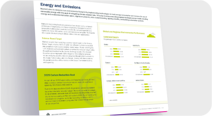 2021 SERVE 360 REPORT ESG PROGRESS AT MARRIOTT INTERNATIONAL → 25 2025 Carbon Reduction Goal As part of our 2025 Sustainability and Social Impact Goals, Marriott aims to reduce carbon intensity per square meter of conditioned space by 30% from a 2016 baseline. Due to the impacts of the COVID-19 pandemic, Marriott surpassed its carbon intensity reduction target. We do not consider this target to be achieved, because most of the emissions reductions occurred due to low occupancy at Marriott hotels in 2020. We will continue to reevaluate our progress, as normal operating conditions return, and continue to implement programs that reduce energy usage at our properties. Marriott’s Engineering Business Leadership Councils and teams, composed of Directors of Engineering and Cluster Engineering Managers for specific geographic markets, meet quarterly to review the company’s performance against the Serve 360 carbon, water, and waste reduction goals. The Councils also support the monitoring of climate-related risks and opportunities. Science-Based Target Marriott is committed to setting a science-based target via the Science Based Target initiative (SBTi). In 2021, we will submit a letter to establish our company’s intent to set a science-based target. We are reviewing the 1.5°C Scenario to model and evaluate an emissions reduction target, using the pathway modeled for the Service Buildings sector of the Sectoral Decarbonization Approach (SDA). As part of this evaluation process, we are analyzing baseline data and progress through 2020, to determine the Scope 1 and 2 target and time horizon. Marriott will then determine the parameters that will be needed within Scope 3 emissions tracking and reporting. Global and Regional Environmental Performance CARBON INTENSITY Kilograms per m2 of conditioned space Global 2020 2019 2018 2016 (baseline) 85.31 113.43 115.57 126.21 Asia Pacific 2020 2019 2018 2016 (baseline) 106.73 145.35 144.84 163.36 Canada 2020 2019 2018 2016 (baseline) 59.66 69.51 N/A* 80.53 Caribbean & Latin America 2020 2019 2018 2016 (baseline) 77.00 90.11 N/A* 93.85 Europe, Middle East & Africa 2020 2019 2018 2016 (baseline) 91.00 132.20 140.68 143.42 United States 2020 2019 2018 2016 (baseline) 73.22 94.02 97.90 107.56 Energy and Emissions Marriott aims to minimize our environmental footprint by implementing technologies to track energy consumption and increase the use of renewable energy with the goal of mitigating climate-related risks. This also involves executing targeted strategies across hotels including energy and environmental action plans, signature projects, retro-commissioning, lighting retrofits, and building automation systems. * Data is unavailable .