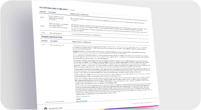 ESG PROGRESS AT MARRIOTT INTERNATIONAL → 73 ESEG PROAR TMS ORINOL OCCUPATIONAL HEALTH AND SAFETY continued Indicator Description Response and / or References 403-2 Hazard identification, risk assessment and incident investigation Marriott’s Global Safety and Security Team conducts regular Safety/Security Assessments at all our hotels globally, based on the individual hotel’s risk ratings. 403-4 Worker participation, consultation and communication on occupational health and safety Marriott’s Be Safe program requires that each hotel has an Executive Level Leader assume the role of Be Safe Champion. One aspect of this role is to ensure the ongoing success of an active Safety Committee. It is common practice that associates from various departments participate in the committees. As part of the Be Safe program, we have continued safety training for all U.S. associates at managed properties, as well as observation, reporting, and recognition programs. 403-9 Work-related injuries In 2020, Marriott had no known work-related fatalities. TRAINING AND EDUCATION Indicator Description Response and / or References 404 * Management approach Training and continuous learning are essential to maintaining our renowned culture that focuses on associate engagement, participative management, and outstanding customer service. To meet the demands of Marriott’s global growth, we invest in a strong leadership pipeline to prepare associates to assume advanced leadership roles. Strategies and Programs: Through skills training programs, professional development opportunities, digital learning experiences, and a growing footprint of hotels, we provide associates with a multitude of choices for career and personal growth. In 2020, Marriott continued the development of an unparalleled learning experience for managed and franchise associates that focuses on building digital learning paths customized for their role. A revamped learning site, the Digital Learning Zone (DLZ), personalizes and simplifies the identification and assignment of training by region, brand, and associate role. Functionality of the DLZ includes auto assignment of all required training for all associates, easy-to-follow training plans sorting by due date, and dynamic team management for managers of others and leaders to track how their teams are progressing. This helps to streamline all training efforts across numerous roles on property, including Front Office, Event Management, and property leadership associates, as well as above-property associates. In addition, to support Marriott’s global presence, our learning systems are available in 16 languages: English, Spanish, Chinese Traditional, Chinese Simplified, Japanese, Korean, Thai, Russian, Turkish, Arabic, French, German, Italian, Polish, Portuguese, and Vietnamese. Functional-Based Training: Marriott has focused on making learning simpler for associates across all areas of the business. We provide functional-based training to associates, including our sales, front-of-house, engineering & facilities management, food & beverage, and culinary teams. Through the DLZ, associates select the function in which they work, as well as any additional work duties, and the system assigns the required and recommended trainings to them. Continuing Education: Additionally, we offered managed associates tuition reimbursement and flexible schedules to attend school and cross-training to gain experience and skills in various departments, as well as work-at-home options. Succession Planning: To help prepare managed leaders for more senior positions with greater scope and complexity, Marriott conducts structured talent development discussions to provide our senior leadership team with information on bench strength, including profiles that feature each individual’s past accomplishments, current contributions, development areas, and readiness for new or expanded responsibilities. Additionally, we maintain a series of proprietary programs to develop our high-potential talent. Innovation: For years, we have organized Innovation Days where corporate headquarters and regional offices globally host thought leaders, innovation challenges, and creative skill building. During the multiday event, associates participate in interactive sessions to learn design-thinking approaches to problem solving and best practices for brand storytelling. In 2020, Innovation Days were paused in light of the COVID-19 pandemic. Associates also experience rapid prototyping of physical and digital ideas. Marriott’s focus on innovation continues through our Innovation Speaker Series and Underground U, a peer-to-peer learning and teaching exchange. Part design garage, part research lab, part test track, Underground U enables real-time experimentation and feedback from our customers before we go to market. Awards and Recognition Careers Heart of the House * Applies primarily to managed associates.