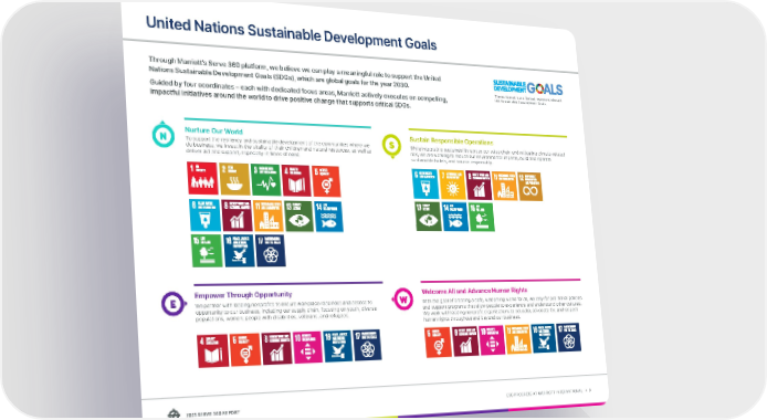 2021 SERVE 360 REPORT ESG PROGRESS AT MARRIOTT INTERNATIONAL → 9 United Nations Sustainable Development Goals Through Marriott’s Serve 360 platform, we believe we can play a meaningful role to support the United Nations Sustainable Development Goals (SDGs), which are global goals for the year 2030. Guided by four coordinates – each with dedicated focus areas, Marriott actively executes on compelling, impactful initiatives around the world to drive positive change that supports critical SDGs. Welcome All and Advance Human Rights With the goal of creating a safe, welcoming world for all, we rally for pro-travel policies and support programs that allow people to experience and understand other cultures. We work with leading nonprofit organizations to educate, advocate for, and respect human rights throughout and beyond our business. Empower Through Opportunity We partner with leading nonprofits to ensure workplace readiness and access to opportunity to our business, including our supply chain, focusing on youth, diverse populations, women, people with disabilities, veterans, and refugees. Nurture Our World To support the resiliency and sustainable development of the communities where we do business, we invest in the vitality of their children and natural resources, as well as deliver aid and support, especially in times of need. Sustain Responsible Operations While integrating sustainability across our value chain and mitigating climate-related risk, we are working to reduce our environmental impacts, build and operate sustainable hotels, and source responsibly. The numbered icons (below) represent relevant UN Sustainable Development Goals.