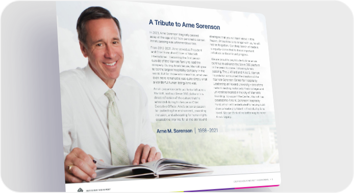 ESG PROGRESS AT MARRIOTT INTERNATIONAL → 5 ESEG PROAR TMS ORINOL A Tribute to Arne Sorenson Arne M. Sorenson | 1958–2021 In 2021, Arne Sorenson tragically passed away at the age of 62 from pancreatic cancer. Arne’s passing was a tremendous loss. From 2012-2021, Arne served as President and Chief Executive Officer of Marriott International – becoming the first person outside of the Marriott family to lead the company. During Arne’s tenure, Marriott grew to be the largest hospitality company in the world. But for those who knew him, what was even more remarkable was quite simply what a wonderful human being Arne was. Arne’s presence continues to be felt across Marriott, and our Serve 360 platform is a direct reflection of the culture that he advanced during his tenure as Chief Executive Officer. Arne’s personal passion for protecting the environment, promoting inclusion, and advocating for human rights created the imprints for all the stories and strategies that you will learn about in this Report. While Arne is no longer with us, he will not be forgotten. Our deep bench of leaders is equally committed to these important initiatives and continued progress. We are proud to pay tribute to Arne as we continue to advance the Serve 360 platform in the years to come. Following Arne’s passing, The J. Willard and Alice S. Marriott Foundation announced the creation of the Marriott-Sorenson Center for Hospitality Leadership at Howard University – one of the nation’s leading historically Black colleges and universities located in the city of Marriott’s founding. To support the Center, Marriott has created the Arne M. Sorenson Hospitality Fund, which will be dedicated to helping build diverse leadership talent in the industry Arne loved. We can think of no better way to honor Arne’s legacy.