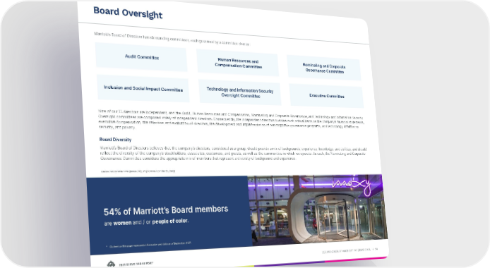 ESG PROGRESS AT MARRIOTT INTERNATIONAL → 54 2021 SERVE 360 REPORT Marriott’s Board of Directors has six standing committees, each governed by a committee charter: Nine of our 13 directors are independent, and the Audit, Human Resources and Compensation, Nominating and Corporate Governance, and Technology and Information Security Oversight committees are composed solely of independent directors. Consequently, the independent directors oversee such critical items as the company’s financial statements, executive compensation, the selection and evaluation of directors, the development and implementation of our corporate governance programs, and technology, information security, and privacy. Board Diversity Marriott’s Board of Directors believes that the company’s directors, considered as a group, should provide a mix of backgrounds, experience, knowledge, and abilities, and should reflect the diversity of the company’s stockholders, associates, customers, and guests, as well as the communities in which we operate. As such, the Nominating and Corporate Governance Committee considers the appropriate mix of members that represent a diversity of background and experience. 54% of Marriott’s Board members are women and / or people of color . Board Oversight Audit Committee Inclusion and Social Impact Committee Human Resources and Compensation Committee Technology and Information Security Oversight Committee Nominating and Corporate Governance Committee Executive Committee Below: Moxy Milan Malpensa Airport (Somma Lombardo, Italy) * Content on this page represents information and data as of September 2021.