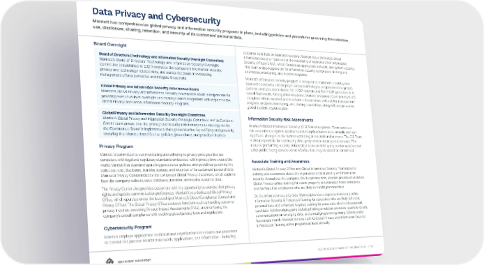 ESG PROGRESS AT MARRIOTT INTERNATIONAL → 56 2021 SERVE 360 REPORT Data Privacy and Cybersecurity Marriott has comprehensive global privacy and information security programs in place, including policies and procedures governing the collection, use, disclosure, sharing, retention, and security of its customers’ personal data. Board Oversight Board of Directors (Technology and Information Security Oversight Committee) Marriott’s Board of Directors’ Technology and Information Security Oversight Committee (established in 2021) oversees the company’s information security, privacy and technology-related risks, and assists the Board in overseeing management efforts to monitor and mitigate those risks. Global Privacy and Information Security Governance Board Marriott’s Global Privacy and Information Security Governance Board is responsible for providing executive-level oversight and strategic risk management with respect to the Global Privacy and Global Information Security Programs. Global Privacy and Information Security Oversight Committee Marriott’s Global Privacy and Information Security Oversight Committee and its Continent Committees ensure that the privacy and security risk management strategy set by the Governance Board is implemented throughout Marriott by verifying and generally ensuring that Marriott has effective policies, procedures, and practices in place. Privacy Program Marriott is committed to communicating and adhering to privacy principles that are consistent with legal and regulatory standards embedded within privacy laws around the world. Marriott has standard operating procedures, policies, and guidelines governing the collection, use, disclosure, transfer, storage, and retention of its customers’ personal data. Marriott’s Privacy Center includes the company’s Global Privacy Statement, which explains how the company collects, uses, discloses, transfers, and retains customer data. The Privacy Center also provides customers with the opportunity to exercise their privacy rights and update communication preferences. Marriott has a dedicated Global Privacy Office, which operates under the leadership of Marriott’s Global Compliance Counsel and Privacy Officer. The Global Privacy Office oversees functions such as handling customer privacy inquiries, executing Privacy Impact Assessments (PIAs), and monitoring the company’s overall compliance with evolving global privacy laws and regulations. Cybersecurity Program Marriott employs appropriate technical and organizational measures and processes to control and protect Marriott’s network, applications, and information – including customer data held on Marriott’s systems. Marriott has a dedicated Global Information Security Team under the leadership of Marriott’s Chief Information Security Officer (CISO), which focuses on application, network, and system security. This team is also responsible for information security compliance, training and awareness, monitoring, and incident response. Marriott’s information security program is designed to implement a multilayered approach to security and employs various technologies and processes to protect systems and data and includes ISO 27001 controls and ISO 27002 guidelines in its overall framework. Among other measures, Marriott is Payment Card Industry (PCI) compliant where required and maintains a documented vulnerability management program, endpoint monitoring, and alerting capabilities, along with an up-to-date global incident response plan. Information Security Risk Assessments Marriott’s Global Information Security (GIS) Risk Management Team conducts risk assessments against Marriott's critical applications at least annually and with significant changes to the internal operating or external environments. The GIS Team is also responsible for conducting third-party vendor security assessments. This includes performing security vulnerability scans on third-party vendor websites and other public-facing servers where Marriott data may be stored or transmitted. Associate Training and Awareness Marriott’s Global Privacy Office and Global Information Security Teams provide training and awareness about the importance of data privacy and information security throughout the company. On the privacy side, Marriott provides mandatory Global Privacy online training for above-property and managed hotel associates, and for franchise employees who are likely to handle personal data. On the information security side, Marriott provides a separate mandatory online Information Security & Protection Training for associates who are likely to handle personal data and enhanced targeted training for associates who handle payment card data. Additional programs include phishing simulation exercises, quarterly emails, communications on emerging risks, and annual programming during Cybersecurity Awareness month. Marriott reviews both its Global Privacy and Information Security & Protection Training online programs at least annually.