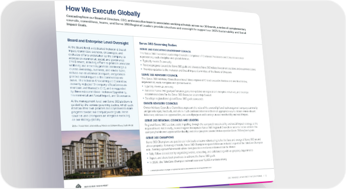 2021 SERVE 360 REPORT ESG PROGRESS AT MARRIOTT INTERNATIONAL → 12 How We Execute Globally Serve 360 Governing Bodies SERVE 360 EXECUTIVE LEADERSHIP COUNCIL The Serve 360 Executive Leadership Council is comprised of Continent Presidents and C-level executives representing each discipline and global division. n T ypically meets 2x annually n R eviews progress toward the Serve 360 goals and discusses Serve 360-related investment decisions and recommendations n Pr ovides updates to the Inclusion and Social Impact Committee of the Board of Directors SERVE 360 ADVISORY COUNCIL The Serve 360 Advisory Council consists of direct reports of C-level executive leaders and one level below, representing each discipline and global division. n T ypically meets 4x annually n Assesses Ser ve 360 goal performance, provides updates on regional and discipline initiatives, and develops recommendations for the Serve 360 Executive Leadership Council n De velops regional and global Serve 360 goal scorecards OWNER ADVISORY COUNCILS Owner Advisory Councils or Committees represent the voice of the ownership/franchise/management company community and provide input, feedback, and advice. Each continent determines the most appropriate way to discuss owner-relevant initiatives, collaboration opportunities, and overall progress and learnings around sustainability and social impact. SERVE 360 REGIONAL COUNCILS AND LEADERS Regional Serve 360 Leaders assist in pulling through the company’s sustainability and social impact strategy at the regional level. Additionally, several regions incorporate Serve 360 Regional Councils in order to better address the company’s risks and opportunities locally, and drive progress toward their respective Serve 360 regional goals. SERVE 360 CHAMPIONS Serve 360 Champions are passionate individuals or teams volunteering to be the face and energy of Serve 360 on and above property. At managed hotels, Serve 360 Champion responsibilities are included as part of the TakeCare Champion role, forming a powerful network where best practices and lessons learned can be shared. n Rally f ellow associates by organizing events, educating, and collaborating with on-property departments n R eport and share best practices to achieve the Serve 360 goals n In 2020, the TakeCare Champion network was over 12,000 members strong Board and Enterprise Level Oversight At the Board level, a dedicated Inclusion & Social Impact Committee oversees, encourages, and evaluates efforts undertaken by the company to address environmental, social, and governance (ESG) issues, including efforts to promote associate wellbeing and inclusion; promote and leverage a diverse ownership, customer, and vendor base; reduce our environmental impact; and promote positive social impact in the communities we serve. The Inclusion & Social Impact Committee currently includes 13 company officer/associate members and Marriott's CEO, and is supported by three subcommittees: Inclusive Opportunity, Environmental and Social Impact, and Governance. At the management level, our Serve 360 platform is guided by the various governing bodies, which each maintain their own priorities and objectives to make progress toward our companywide goals.These Councils and Champions are integral in executing on our strategy globally. Cascading from our Board of Directors, CEO, and executive team to associates working at hotels across our 30 brands, a series of complementary councils, committees, teams, and Serve 360 Regional Leaders provide structure and oversight to support our 2025 Sustainability and Social Impact Goals. * Content presented on page 12 represents metrics and information as of September 2021. Below: Protea Hotel Johannesburg Wanderers (Johannesburg, South Africa)