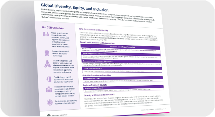 2021 SERVE 360 REPORT ESG PROGRESS AT MARRIOTT INTERNATIONAL → 36 Global Diversity, Equity, and Inclusion Global diversity, equity, and inclusion (DE&I) are integral to how we do business every day, as we engage with our key stakeholders: associates, customers, owners, and suppliers. Since Marriott’s founding in 1927, our core value of putting people first and our commitment to diversity, equity, and inclusion have guided how we interact with people and how we do business every day. This is the foundation that sustains our “TakeCare Culture” and business success. Our DE&I Objectives Create an environment where all associates, customers, owners, and suppliers feel welcomed and embraced with opportunity across all aspects of our business Increase the number of diverse- and women- owned hotels Establish a supportive and inclusive work environment where associates are brought together by a common desire to experience opportunity, community, and purpose Provide diverse-owned suppliers with access and equity in our supply chain Increase the presence of women and people of color in the highest levels of management and other key decision-making positions Excel at serving and marketing to welcome diverse travelers DE&I Accountability and Leadership Our CEO and senior leadership team have established longstanding, comprehensive diversity, equity, and inclusion performance metrics that are part of their annual management business objectives and compensation plans. Marriott’s DE&I strategy is directly overseen by our Board-level Inclusion and Social Impact Committee . To further support accountability, Marriott has established a leadership governance structure for DE&I. Board Level Committee and Subcommittees Diversity and Inclusion Talent Council The Diversity and Inclusion Talent Council is comprised of cross-discipline senior leaders to drive outcomes in achieving our diverse recruitment and talent strategy. This strategy includes a focus on diverse candidate slates to increase the identification and recruitment of diverse talent at an entry point for vice president positions. The Council also helps develop and sponsor innovative strategies and initiatives that strengthen relationships with external organizations. Inclusion & Social Impact Committee Board committee focused on advancing inclusive opportunity through our people-first culture and efforts to foster associate wellbeing and inclusion and to promote this focus with our key stakeholders. Inclusive Opportunity Subcommittee Define strategy and goals, drive accountability, and execute an integrative approach to inclusive opportunity across all business operations with specific focus on associates, customers, owners, and suppliers. Provides oversight, encourages, and evaluates efforts undertaken by the company to reduce Marriott's environmental impact and promote a positive social impact in the communities Marriott serves throughout the world. Provides oversight, encourages, and evaluates efforts undertaken by the company to address governance issues. Environmental & Social Impact Subcommittee Governance Subcommittee Global Business Leader Committee Global Inclusion Council CEO-led council established with Continent Presidents to drive ownership and accountability to promote inclusive opportunities globally. Regional/Continent Councils Regional Inclusion Council Drives regional strategy aligned to global diversity, equity, and inclusion strategy and continental shared business priorities.