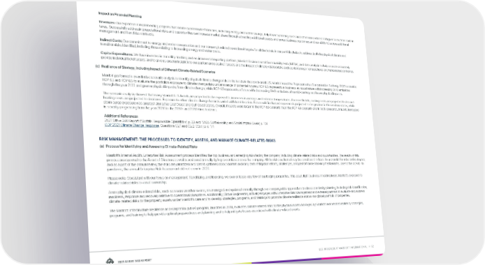 ESG PROGRESS AT MARRIOTT INTERNATIONAL → 82 ESEG PROAR TMS ORINOL Impact on Fina ncial Planning Revenues: Our expertise in implementing projects that create operational efficiencies, including energy and water savings, help lower operating costs and offset risks related to higher costs from carbon taxes. Successfully addressing reputational risks and opportunities can increase market share through attracting additional guests and group business customers and our ability to secure additional management and franchise contracts. Indirect Costs: Our commitment to energy and water conservation and our company’s related operational targets for all the hotels in our portfolio, helps to address both the physical climate and transition risks identified, including those relating to increasing energy and water costs. Capital Expenditures: We have invested in our utility tracking and environmental reporting platform, Marriott Environmental Sustainability Hub (MESH), and data analysis to help us more accurately provide individual hotel targets and to give us greater insight into our performance against targets and the impact of climate-related risks such as rising mean temperatures and temperature extremes. (c) R esilience of Strategy, Including Impact of Different Climate-Related Scenarios Mar riott performed a quantitative scenario analysis to identify physical climate change risks to its hotels in the continental U.S. Marriott used the Representative Concentration Pathway (RCP) scenarios RCP 4.5 and RCP 8.5 to evaluate the portfolio’s exposure to climate change risks under a range of potential futures. RCP 8.5 represents a business-as-usual future with increasing GHG emissions through the year 2100 and greater physical impacts from climate change, while RCP 4.5 represents a future with decreasing GHG emissions after mid-century and lesser physical impacts. The scenario an alysis showed that many Marriott U.S. hotels are projected to be exposed to increases in average and extreme temperatures. For most hotels, cooling costs are projected to rise and heating costs are projected to decrease. Exposure to other climate change hazards varied with hotel location. Future wildfire hazard exposure is projected to be greatest in the western states, while storm surge exposure was greatest along the East Coast and Gulf Coast states. Overall, impacts were larger in the RCP 8.5 scenario than the RCP 4.5 scenario and in both scenarios, impacts increased in severity progressing from the year 2030 to the 2050- and 2080-time horizons. Additional References 2021 Ser ve 360 Report (“Sustain Responsible Operations”, p. 23 and “2025 Sustainability and Social Impact Goals”, p. 10) CDP 2021 Climate Change Response, Questions C2.1 and C2.2-C3.4 (p. 6-17) RISK MANAGEMENT: THE PROCESSES TO IDENTIFY, ASSESS, AND MANAGE CLIMATE-RELATED RISKS (a) Pr ocess for Identifying and Assessing Climate-Related Risks Mar riott’s Internal Audit’s Enterprise Risk Assessment process identifies the top business and emerging risks facing the company, including climate-related risks and opportunities. The results of this process are reported to the Board of Directors as well as reviewed annually by key executives across the company. All the risks evaluated may be considered to have the potential for substantive impact, and as a part of the annual review, the risks are prioritized and data is gathered about current and long-term mitigation efforts, challenges, and performance tracking mechanisms. Due to the COVID-19 pandemic, the annual Enterprise Risk Assessment did not occur in 2020. Please n ote: Consistent with our focus on management, franchising, and licensing, we own or lease very few of our lodging properties. This asset-light business model reduces Marriott’s exposure to climate-related risks to asset ownership. Acut e physical climate-related risks, such as severe weather events, are managed and updated annually through our companywide approach to business continuity planning, including risk identification, readiness, response and recovery relative to operational disruptions. Additionally, Global Engineering actively engages with Enterprise Risk Management and external partners to evaluate and address climate-related risks to the property assets under Marriott’s care and to develop strategies, programs, and trainings to promote climate resilience across our global portfolio of properties. The Mar riott Infrastructure Resilience and Adaptation (MIRA) program, launched in 2019, evaluates climate-related risks to the physical assets managed by Marriott and creates resiliency strategies, programs, and training to help provide optimal preparedness and planning and to help mitigate losses associated with climate-related events.