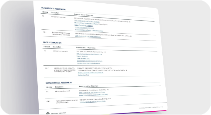 ESG PROGRESS AT MARRIOTT INTERNATIONAL → 75 ESEG PROAR TMS ORINOL HUMAN RIGHTS ASSESSMENT Indicator Description Response and / or References 412 Management approach 2021 Serve 360 Report (“2025 Sustainability and Social Impact Goals”, p. 10 and “Human Rights”, p. 49) 2025 Sustainability and Social Impact Goals Welcome All and Advance Human Rights (“Human Rights”) Human Rights Policy Statement 2020 Modern Slavery Statement Global Procurement Supplier Conduct Guidelines 412-1 Employee training on human rights policies or procedures 2021 Serve 360 Report (“2025 Sustainability and Social Impact Goals”, p. 10 and “Human Rights”, p. 49) 2025 Sustainability and Social Impact Goals LOCAL COMMUNITIES Indicator Description Response and / or References 413 Management approach 2021 Serve 360 Report (“Nurture Our World”, p. 14) 2025 Sustainability and Social Impact Goals Nurture Our World TakeCare Relief Fund Partnership with Children’s Miracle Network The Ritz-Carlton Community Footprints 413-2 Operations with local community engagement, impact assessments and development programs Community engagement activities occur across our portfolio. 2021 Serve 360 Report (“How We Execute Globally”, p. 12 and “Nurture Our World”, p. 14) 2025 Sustainability and Social Impact Goals Nurture Our World SUPPLIER SOCIAL ASSESSMENT Indicator Description Response and / or References 414 Management approach 2021 Serve 360 Report (“Nurture Our World”, p. 14) 2025 Sustainability and Social Impact Goals Global Procurement Supplier Conduct Guidelines 414-1 New suppliers that were screened using social criteria 2021 Serve 360 Report (“Responsible Sourcing”, p. 32) 2025 Sustainability and Social Impact Goals