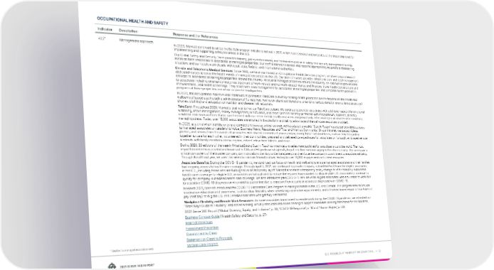 ESG PROGRESS AT MARRIOTT INTERNATIONAL → 72 ESEG PROAR TMS ORINOL OCCUPATIONAL HEALTH AND SAFETY Indicator Description Response and / or References 403 * Management approach In 2020, Marriott continued to utilize the Be Safe program initially rolled out in 2017, which has increased accountability at the leadership level for implementing and supporting safety initiatives in the U.S. Our Global Safety and Security Team provides training, policy enforcement, and technical expertise in safety and security management to help minimize harm and losses to associates at managed properties. Our staff is trained to assess and respond appropriately to potential threatening situations and our hotels work closely with local, state, federal, and international authorities. On-site and Telephonic Medical Services: Since 1985, we have maintained an Occupational Health Services program, which employs a team of dedicated nurses to serve the health needs of managed associates in the U.S. Our team of nurses provides telephonic care and case management services to associates at managed properties around the country. At several managed properties around the country, on-site nurses provide care to associates including emergency response, treatment of work-related and nonwork-related injuries and illnesses, travel health consultations and immunizations, and health screenings. They assist with case management for associates at managed properties and complete health promotion programs at these properties and at our corporate headquarters. In 2020, the occupational health nurses continued to promote a TakeCare culture by hosting health promotion events focused on the health and wellbeing of associates including administration of flu vaccines, having on-site blood donations, organizing various donation events (eyeglasses, cell phones, clothing) and education on nutrition and disease risk reduction. TakeCare: Throughout 2020, Marriott’s goal was to live our TakeCare culture. We continue to provide associates with additional support for emotional wellbeing, stress management, money management, mindfulness, and more. Marriott recently partnered with meQuilibrium, a proven, clinically validated resilience platform that is synchronized with our other mental health resources and proactively refers managed associates who need help managing stress. Today, over 15,000 associates are enrolled in this platform and taking advantage of the self-care resources provided. In 2020, at a time when transparency and connections were as critical as ever, we introduced a weekly “Stay in Touch” newsletter providing updates to managed associates on Leadership Voice, Business News, Resources and Tips, and Marriott Community. On our intranet, we posted videos, photos, and stories from thousands of associates who shared moments of peace and joy during these turbulent times, such as how they pulled together to care for each other, volunteered in their communities, prepared and delivered care packages for associates on furlough, embraced remote workouts with family members across regions, delved into artistic talents, and more. During 2020, 23 editions of the weekly #MarriottStrong Stay In Touch communications series were published for associates around the world. The most impactful content was curated and broadcast to GMs and HR professionals globally to pull into their own messaging to their teams locally. This series was a critical component of the broader company communications plan to provide transparency and reinforce the company’s commitment to associate wellbeing. Through this difficult year, we used this series to maintain Marriott culture, leading to over 75,000 engagements with these resources. Associate Benefits: During the COVID-19 pandemic, we continued our focus on health and wellbeing to ensure managed associates and their families had ongoing access to health care coverage. Through April 9, 2021, we continued to provide company-subsidized healthcare for eligible associates in the U.S., including those who are furloughed or on temporary layoff. Marriott also made a temporary policy change to offer company-subsidized health care coverage for eligible U.S. associates on furlough and to reduce the required hours worked to allow eligible U.S. associates to continue to qualify for company-subsidized health care coverage. We also introduced paid COVID-19 sick leave for eligible associates who are unable to work due to a positive COVID-19 diagnosis or who need to quarantine due to exposure from a guest or associate diagnosed with COVID-19. In March 2021, Marriott introduced the COVID-19 Vaccination Care Program to managed hotels in the U.S. and Canada. The program aims to provide vaccination education and awareness, tools to allow flexibility when scheduling vaccination appointments, and a financial award equal to four hours of pay (half day) to eligible U.S. and Canada associates who get fully vaccinated. Workplace Flexibility and Remote Work Resources: As some associates transitioned to remote work during the COVID-19 pandemic, we refreshed our “Work Ways Guide to Flexibility” and added working virtually resources and online training to support associates working from home for the first time. 2021 Serve 360 Report (“Global Diversity, Equity, and Inclusion”, p. 36; “COVID-19 Response”, p. 16 and “Human Rights”, p. 49) Business Conduct Guide (“Health Safety and Security, p. 37) Heart of the House Harassment Prevention Commitment to Clean Statement on Cleaning Protocols Vaccine Care Program * Applies to managed associates only .