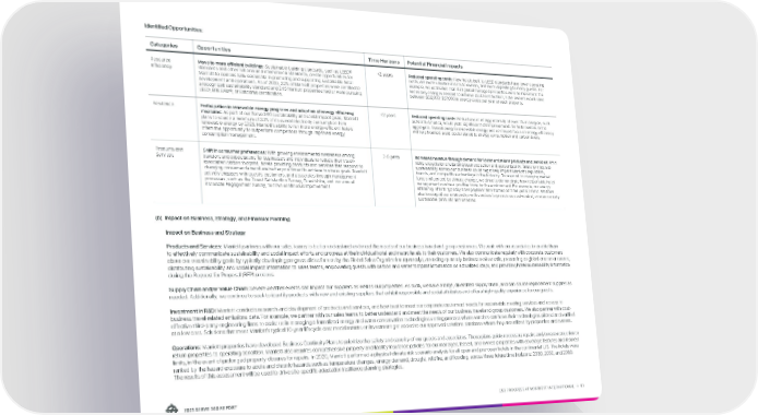 ESG PROGRESS AT MARRIOTT INTERNATIONAL → 81 2021 SERVE 360 REPORT Categories Opportunities Time Horizons Potential Financial Impacts Resource Efficiency Move to more efficient buildings: Sustainable building standards, such as LEED® standards and other national and international standards, create opportunities for Marriott to demonstrate leadership in promoting and supporting sustainable hotel development and operations. As of 2020, 32% of Marriott properties were certified to a recognized sustainability standard and 245 Marriott properties had or were pursuing LEED, BREEAM®, or Estidama certification. <2 years Reduced operating costs: New hotels built to LEED standards have lower operating costs, are more valuable assets to owners, and more appealing to many guests. For example, we estimated that if all global managed properties were to implement the necessary changes needed to achieve LEED certification, hotel owners would save between $38,000-$57,000 in energy costs per year at each property. Resilience Participation in renewable energy programs and adoption of energy efficiency measures: As part of our Serve 360 sustainability and social impact goals, Marriott plans to source a minimum of 30% of its overall electricity consumption from renewable energy by 2025. Marriott's ability to run more energy-efficient hotels offers the opportunity to outperform competitors through improved energy consumption management. <2 years Reduced operating costs: Reductions in energy intensity of even 1% in a region, such as North America, would yield significant NOI improvements for hotel owners in the aggregate. Transitioning to renewable energy and continued focus on energy efficiency will help Marriott avoid costs related to energy consumption and carbon taxes. Products and Services Shift in consumer preferences: With growing environmental awareness among travelers and expectations for businesses and individuals to reduce their travel- associated carbon footprint, hotels providing products and services that respond to changing consumer demand are better positioned to achieve business goals. Marriott actively engages with guests, customers, and associates through management processes, such as the Guest Satisfaction Survey, GuestVoice, and our annual Associate Engagement Survey, to drive continuous improvement. 2-5 years Increased revenue through demand for lower emissions products and services: Amid rising expectations regarding business action and accountability, failure to integrate sustainability across our business could negatively impact Marriott’s reputation, brands, and competitive advantage in the industry. To respond to changing market forces influenced by climate change, we strive to demonstrate how responsible hotel management can be a positive force for the environment. For example, our energy- efficiency efforts typically have payback time frames of three years or less. We have also leveraged our relationship with vendors to provide us cost-neutral, environmentally sustainable products and services. Identified Opportunities: (b) Impact on Business, Strategy, and Financial Planning Impact on Business and Strategy Products and Services: Marriott partners with our sales teams to better understand and meet the needs of our business travel and group customers. We work with our associates to enable them to effectively communicate sustainability and social impact efforts and progress at the individual hotel and macro levels to their customers. We also communicate regularly with corporate customers about our sustainability goals by typically developing progress slides for use by the Global Sales Organization (quarterly), attending quarterly business review calls, presenting at global customer events, distributing sustainability and social impact information to sales teams, empowering guests with carbon and water footprint information on actualized stays, and providing hotel sustainability information during the Request for Proposal (RFP) process. Supply Chain and/or Value Chain: Severe weather events can impact our suppliers as well as our properties. As such, we have a large, diversified supply chain, and can source replacement supplies as needed. Additionally, we continue to seek to identify products with new and existing suppliers that exhibit responsible and social attributes and offer a high-quality experience for our guests. Investment in R&D: Marriott conducts research and development of products and services, and how best to meet our corporate customers’ needs for sustainable meeting services and access to business travel-related emissions data. For example, we partner with our sales teams to better understand and meet the needs of our business travel and group customers. We also partner with cost- effective third-party engineering firms to assist us in managing a formalized energy and water conservation technologies vetting process where vendors can have their technologies piloted and verified at a low cost. Solutions that meet Marriott’s typical 10-year lifecycle cost model returns on investment get added to our approved solutions database where they are utilized by properties and owners. Operations: Marriott properties have developed Business Continuity Plans to prioritize the safety and security of our guests and associates. These plans guide necessary repairs and/or reconstruction to return properties to operating condition. Marriott also requires comprehensive property and liability insurance policies for our managed, leased, and owned properties with coverage features and insured limits, in the event of prolonged property closures for repairs. In 2020, Marriott performed a physical climate risk scenario analysis for all open and pre-open hotels in the continental U.S. The hotels were ranked by the hazard exposure to acute and chronic hazards such as temperature changes, energy demand, drought, wildfire, and flooding, across three future time horizons: 2030, 2050, and 208