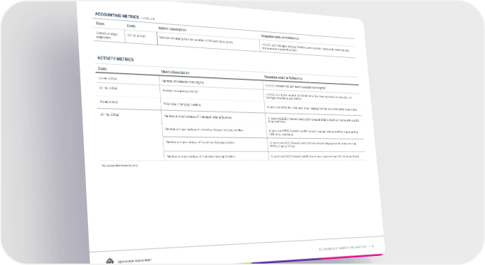 ESG PROGRESS AT MARRIOTT INTERNATIONAL → 78 2021 SERVE 360 REPORT ACCOUNTING METRICS continued Topic Code Metric Description Response and / or Reference Climate change adaptation SV-HL-450a.1 Number of lodging facilities located in 100-year flood zones In 2020, 335 managed lodging facilities were located in areas with extremely high ravine and/or coastal flood risk. ACTIVITY METRICS Code Metric Description Response and / or Reference SV-HL-000.A Number of available room-nights In 2020, Marriott had 395 million available room nights*. SV-HL-000.B Average occupancy rate (%) In 2020, due to the impacts of COVID-19 on the travel and tourism industry, the average occupancy was 35.5%*. SV-HL-000.C Total area of lodging facilities At year-end 2020, the total area of our lodging facilities was 603 million square feet. SV-HL-000.D Number and percentage of managed lodging facilities At year-end 2020, Marriott had 2,083 managed lodging facilities (representing 27.2% of our portfolio). Number and percentage of owned and leased lodging facilities At year-end 2020, Marriott had 66 owned or leased lodging facilities (representing 0.9% of our portfolio). Number and percentage of franchised lodging facilities At year-end 2020, Marriott had 5,402 franchised lodging facilities (representing 70.7% of our portfolio). Number and percentage of timeshare lodging facilities At year-end 2020, Marriott had 91 timeshares (representing 1.2% of our portfolio). * For comparable properties only.