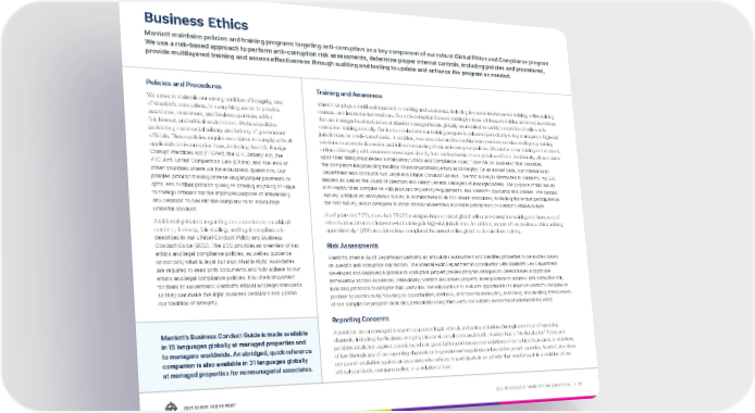 ESG PROGRESS AT MARRIOTT INTERNATIONAL → 55 2021 SERVE 360 REPORT Business Ethics Marriott maintains policies and training programs targeting anti-corruption as a key component of our robust Global Ethics and Compliance program. We use a risk-based approach to perform anti-corruption risk assessments, determine proper internal controls, including policies and procedures, provide multilayered training and assess effectiveness through auditing and testing to update and enhance the program as needed. Policies and Procedures We strive to maintain our strong tradition of integrity, one of Marriott’s core values, in everything we do to provide associates, customers, and business partners with a fair, honest, and ethical environment. We have policies prohibiting commercial bribery and bribery of government officials. These policies require associates to comply with all applicable anti-corruption laws, including the U.S. Foreign Corrupt Practices Act (“FCPA”), the U.K. Bribery Act, the PRC Anti-Unfair Competition Law (China), and the laws of other countries where we have business operations. Our policies prohibit making or receiving improper payments or gifts, and further prohibit giving or offering anything of value to foreign officials for the improper purpose of influencing any decision to benefit the company or to encourage unlawful conduct. Additional guidance regarding our commitment to ethical conduct, honesty, fair dealing, and legal compliance is described in our Ethical Conduct Policy and Business Conduct Guide (BCG). The BCG provides an overview of key ethics and legal compliance policies, as well as guidance on not only what is legal but also what is right. Associates are required to read both documents and fully adhere to our ethics and legal compliance policies. It is vitally important for them to understand Marriott’s ethical and legal standards so they can make the right business decisions and uphold our tradition of integrity. Training and Awareness Marriott employs a multilevel approach to training and awareness, including in-person instructor-led training, online training courses, and instructor-led webinars. Our anti-corruption focused training includes all these modalities and most associates that are manager level and above at Marriott managed hotels globally are required to certify completion of online anti- corruption training annually. Our instructor-led webinar training program is delivered periodically to key managers in high-risk jurisdictions on a risk-based basis. In addition, new executive and leadership team members receive small group training sessions to promote discussion and full understanding of our anti-corruption policies. We reinforce our training and Marriott’s culture of integrity with awareness messages directly from our leadership to our global workforce. Additionally, all associates upon their hiring must review a mandatory Ethics and Compliance video, “How We Do Business,” that describes the company’s longstanding tradition of uncompromising ethics and integrity. On an annual basis, our Internal Audit Department also conducts two Legal and Ethical Conduct Surveys. The first survey is distributed to Marriott’s Top 250 leaders as well as the Board of Directors and select General Managers of managed hotels. The purpose of this survey is to certify their compliance with laws and regulatory requirements, and Marriott’s standards and policies. The second survey, which is an anonymous survey, is administered to all non-hourly associates, excluding those that participated in the first survey, and is designed to more broadly understand associate perceptions of Marriott’s ethical culture. As of year-end 2020, more than 29,000 managers have received global online anti-corruption training and thousands of other leaders attended instructor-led trainings in high-risk jurisdictions. In addition, as part of our business ethics training, approximately 11,000 associates have completed the annual online global trade sanctions training. Risk Assessments Marriott’s Internal Audit Department performs an annual risk assessment and identifies properties to be audited based on specific anti-corruption risk factors. The Internal Audit Department in coordination with Marriott’s Law Department developed and deployed a global anti-corruption property review program designed to detect issues and provide remediation actions as needed. Periodically, Marriott also issues property-level guidance to address anti-corruption risk, including protocols to mitigate third-party risk. We will continue to evaluate opportunities to improve Marriott’s compliance posture by continuously focusing on opportunities, methods, and tools for measuring, assessing, and auditing effectiveness of the compliance program (including periodically using third-party consultants and external benchmarking data). Reporting Concerns Associates are encouraged to report suspected legal, ethical, and policy violations through a number of reporting channels, including the Business Integrity Line or via email to Internal Audit. Marriott has a “No Retaliation” Policy and prohibits retaliation against associates who in good faith report suspected violations of our ethical standards or violations of law through any of our reporting channels or to government regulators or law enforcement agencies. Marriott also does not permit retaliation against an associate who refuses to participate in an activity that would result in a violation of our ethical standards, company policy, or a violation of law. Marriott’s Business Conduct Guide is made available in 15 languages globally at managed properties and to managers worldwide. An abridged, quick reference companion is also available in 31 languages globally at managed properties for nonmanagerial associates.