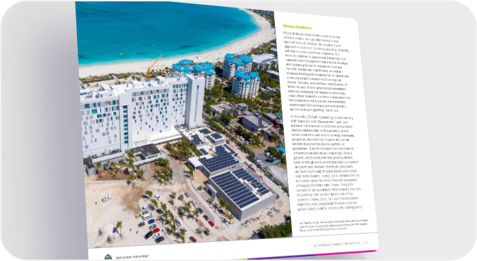 2021 SERVE 360 REPORT ESG PROGRESS AT MARRIOTT INTERNATIONAL → 27 Climate Resilience Physical climate-related risks, such as severe weather events, are typically managed and updated annually through our enterprisewide approach to business continuity planning, including risk identification, readiness, response, and recovery, relative to operational disruptions. Our corporate risk management department develops and updates policies for insurance coverage for both owners and franchisees, as well as business interruption coverage for our operations in regions prone to events such as tropical storms, flooding, and wildfires. Identification of transition and chronic physical climate-related risks and assessing the degree to which they could affect Marriott’s business is integrated into the governance structure and the materiality assessments that underpin our sustainability and social impact platform, Serve 360. Additionally, Global Engineering is collaborating with Marriott’s Risk Management Team and external collaborators to evaluate and address climate-related risks to the property assets under Marriott’s care and to develop strategies, programs, and trainings to promote climate resilience across the global portfolio of properties. Marriott has launched the Marriott Infrastructure Resilience Adaptability (MIRA) project, which evaluates the growing related risks to the physical assets managed by Marriott and promotes resilient strategies, programs, and training to help mitigate losses associated with these events. During 2020, we launched an education series for associates and engineers of managed hotels called ‘Three Things for Resilience’ and published three training modules focused on cold weather protection of our systems. During 2021, two additional modules related to asset preparation for hurricanes and power outages will be added to the training series. Left: The Ritz-Carlton, Turks & Caicos’ (Grace Bay, Turks and Caicos Islands) solar PV system is expected to generate approximately 310 MWh annually (Photo credit: FortisTCI/Spotlight Communications)