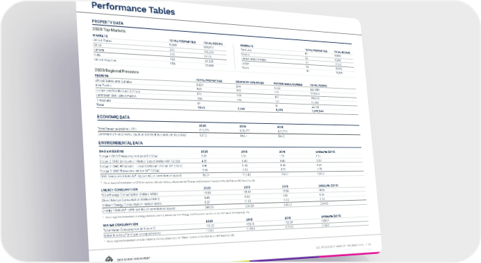 ESG PROGRESS AT MARRIOTT INTERNATIONAL → 59 2021 SERVE 360 REPORT Performance Tables PROPERTY DATA 2020 Top Markets MARKETS T OTAL PROPERTIES T OTAL ROOMS United States 5 ,349 888 ,614 China 385 125 ,288 Canada 25 5 5 4,191 India 123 25 ,326 United Kingdom 108 20 ,500 MARKETS T OTAL PROPERTIES T OTAL ROOMS Germany 87 19 ,500 Mexico 92 18 ,196 United Arab Emirates 61 17 ,930 Japan 64 15 ,618 Spain 92 13 ,878 2020 Regional Presence REGIONS T OTAL PROPERTIES COMP ANY-OPERATED FR ANCHISED/LICENSED T OTAL ROOMS United States and Canada 5 ,534 814 4 ,720 92 4,090 Asia Pacific 843 7 00 143 237 ,044 Europe and Middle East & Africa 916 5 09 40 7 186 ,573 Caribbean and Latin America 258 126 132 5 2,582 Timeshare 91 91 22, 755 Total 7 ,642 2, 149 5 ,493 1 ,423,044 ECONOMIC DATA 2020 2019 2018 Total Revenue (million USD) $10 ,571 $20 ,972 $20 ,758 Community Investments (cash and in-kind donations million USD) $21 .2 $5 3.7 $47 .9 ENVIRONMENTAL DATA GHG EMISSIONS 2020 2019 2018 B ASELINE (2016) Scope 1 GHG Emissions (million MT CO2e) 0 .97 1 .32 1 .35 1 .24 Scope 2 GHG Emissions – Market Based (million MT CO2e) 4 .19 5 .48 5 .48 5 .30 Scope 2 GHG Emissions – Location Based (million MT CO2e) 4 .15 5 .48 5 .48 5 .30 Scope 3 GHG Emissions (million MT CO2e) 3 .46 4 .84 4 .79 4 .78 GHG Emissions Intensity* (kg per m2 of conditioned space) 85 .31 113 .43 115 .57 126 .21 * For a regional break down of GHG emissions intensity metrics, please see the “Energy and Emissions” section of the 2021 Serve 360 Report (p. 25). ENERGY CONSUMPTION 2020 2019 2018 B ASELINE (2016) Total Energy Consumption (million MWh) 13 .83 18 .49 18 .63 16 .39 Direct Energy Consumption (million MWh) 4 .86 6 .85 7 .00 6 .45 Indirect Energy Consumption (million MWh) 8 .97 11 .64 11 .63 9 .94 Energy Intensity* (kWh per m2 of conditioned space) 2 40.95 32 4.39 329 .33 334 .93 * For a regional break down of energy intensity metrics, please see the “Energy and Emissions” section of the 2021 Serve 360 Report (p. 26). WATER CONSUMPTION 2020 2019 2018 B ASELINE (2016) Total Water Consumption (million m3) 101 .33 133 .18 129 .20 130 .67 Water Intensity* (m3 per occupied room) 1 .1601 0 .7015 0 .7003 0 .8413 * For a regional break down of water intensity metrics, please see the “Water” section of the 2021 Serve 360 Report (p. 28).