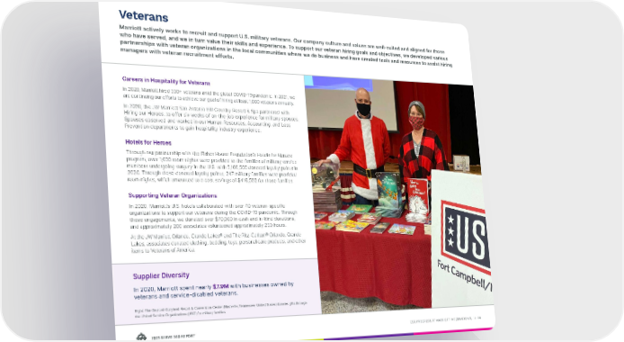 2021 SERVE 360 REPORT ESG PROGRESS AT MARRIOTT INTERNATIONAL → 44 Careers in Hospitality for Veterans In 2020, Marriott hired 300+ veterans amid the global COVID-19 pandemic. In 2021, we are continuing our efforts to achieve our goal of hiring at least 1,000 veterans annually. In 2020, the JW Marriott San Antonio Hill Country Resort & Spa partnered with Hiring our Heroes, to offer six weeks of on-the-job experience for military spouses. Spouses observed and worked in our Human Resources, Accounting, and Loss Prevention departments to gain hospitality industry experience. Hotels for Heroes Through our partnership with the Fisher House Foundation’s Hotels for Heroes program, over 1,600 room nights were provided to the families of military service members undergoing surgery in the U.S. with 5,166,500 donated loyalty points in 2020. Through these donated loyalty points, 247 military families were provided room nights, which amounted to a cost savings of $416,592 for those families. Supporting Veteran Organizations In 2020, Marriott’s U.S. hotels collaborated with over 40 veteran-specific organizations to support our veterans during the COVID-19 pandemic. Through these engagements, we donated over $70,000 in cash and in-kind donations, and approximately 200 associates volunteered approximately 250 hours. At the JW Marriott Orlando, Grande Lakes® and The Ritz-Carlton® Orlando, Grande Lakes, associates donated clothing, bedding, toys, personal care products, and other items to Veterans of America. Veterans Marriott actively works to recruit and support U.S. military veterans. Our company culture and values are well-suited and aligned for those who have served, and we in turn value their skills and experience. To support our veteran hiring goals and objectives, we developed various partnerships with veteran organizations in the local communities where we do business and have created tools and resources to assist hiring managers with veteran recruitment efforts. Supplier Diversity In 2020, Marriott spent nearly $7.9M with businesses owned by veterans and service-disabled veterans. Right: The Gaylord Opryland Resort & Convention Center (Nashville, Tennessee, United States) donates gifts through the United Service Organizations (USO) for military families