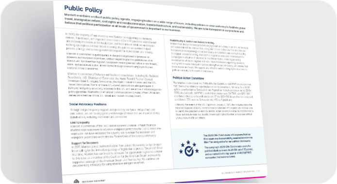ESG PROGRESS AT MARRIOTT INTERNATIONAL → 57 ESEG PROAR TMS ORINOL In 2020, the majority of our advocacy was focused on supporting our business, owners, franchisees, and impacted associates in COVID-19 pandemic-related relief and recovery measures at the local, state, and federal level. While we understand nothing can replace a robust travel economy, the policies we pursued helped provide a bridge and ensure government support for stakeholders and industry. Marriott is committed to participating in the political process to promote its interests and business objectives, without regard to political preferences of its executives. We therefore support candidates seeking elected office at the federal, state, and local level in the United States through Marriott’s employee-funded Political Action Committee. Marriott is a member of industry and business associations, including the Business Roundtable, U.S. Chamber of Commerce, the World Travel & Tourism Council, American Hotel & Lodging Association, the World Economic Forum, and the U.S. Travel Association. Some of these U.S.-based associations also participate in lobbying and policy advocacy activities in the U.S. and are active in advancing public policy priorities. Marriott’s Chief Global Communications & Public Affairs Officer also serves as a member of the U.S. Travel and Tourism Advisory Board. Social Advocacy Positions Through our public policy support and guided by our Serve 360 platform and core values, we aim to engage in a wide range of issues that are important to key stakeholders, including customers and associates. LGBTQ Equality Marriott is a member of the HRC Global Business Coalition, a forum for major multinational businesses to advance workplace protections for LGBTQ associates worldwide. We have endorsed the Equality Act to ensure fair treatment and workplace protections under the law for members of the LGBTQ community. Support for Dreamers In 2017, Marriott joined business leaders from across the country to sign an open letter calling for the immediate passage of legislation to protect “Dreamers”. Since that time, Marriott has continued to advocate for a permanent legislative solution to this issue as a member of the Coalition for the American Dream and recently supported passage of the American Dream and Promise Act. We continue our decades-long advocacy for comprehensive immigration reform. Racial Equity & Justice and Access to Voting Marriott has always encouraged civic engagement and voting in the U.S. on the local and national level. We believe that voting and access to free and fair elections are fundamental underpinnings of our democracy and reinforce our country’s stability. To support access to voting, Marriott has supported associate communications campaigns in advance of elections in the United States, including providing resources on where to register and vote. Marriott believes expanding access to voting will increase voter participation, strengthen our democracy, and ensure that more voices are heard. We oppose any effort to restrict voting rights or access to polls as contrary to the spirit of democracy. Political Action Committee The Marriott International, Inc. Political Action Committee (MARPAC) is a nonpartisan PAC (funded by voluntary contributions made by associates). We strive for a 50/50 split in contributions to Democratic and Republican federal candidates. In the 2019- 2020 election cycle, MARPAC's total disbursements were $417,816, with $204,000 distributed directly to federal candidates. Of the $204,000 in contributions to federal candidates, 55% went to Democrats and 45% to Republicans. Following the events at the U.S. Capitol on January 6, 2021, the company made the decision to pause MARPAC contributions to Members of Congress who did not vote to certify the presidential election results. While MARPAC’s historical contributions to these individuals were not sizable, it was a principled decision to keep our political giving aligned with our values. The 2020 CPA-Zicklin Index of Corporate Political Disclosure and Accountability awarded Marriott the First Tier designation for our political disclosures. The company's 2020 CPA-Zicklin index score for political disclosure was 84.29 (59 out of 70 points), and we ranked in the top quarter of 492 S&P 500 companies that were reviewed. Public Policy Marriott maintains a robust public policy agenda, engaging leaders on a wide range of issues, including policies on visas and entry to facilitate global travel, immigration reform, civil rights and nondiscrimination, travel infrastructure, and sustainability. We aim to be transparent in our practices and believe that political participation at all levels of government is important to our business.