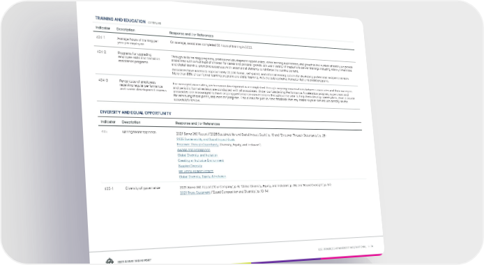 ESG PROGRESS AT MARRIOTT INTERNATIONAL → 74 ESEG PROAR TMS ORINOL TRAINING AND EDUCATION continued Indicator Description Response and / or References 404-1 Average hours of training per year per employee On average, associates completed 56 hours of training in 2020. 404-2 Programs for upgrading employee skills and transition assistance programs Through skills training programs, professional development opportunities, other learning experiences, and growth in the number of hotels, we provide associates with a multitude of choices for career and personal growth. We use a variety of mediums to deliver trainings including videos, simulations and digital learning, providing associates with experiential elements to reinforce the training content. Associates have access to approximately 20,000 formal, self-paced, and informal learning options for developing professional and personal skills. More than 85% of our formal learning programs are digital learning, with the balance being instructor-led or blended programs. 404-3 Percentage of employees receiving regular performance and career development reviews For managed associates, performance development is accomplished through ongoing conversations between associates and their managers and periodic formal reviews are conducted with all associates. Under our Leadership Performance Acceleration program, supervisors and associates are encouraged to have ongoing performance conversations throughout the year to help them develop career plans, chart a course for achieving those plans, and monitor progress. This allows for just-in-time feedback that any leader or peer can include directly on the associate’s review. DIVERSITY AND EQUAL OPPORTUNITY Indicator Description Response and / or References 405 Management approach 2021 Serve 360 Report (“2025 Sustainability and Social Impact Goals”, p. 10 and “Empower Through Opportunity”, p. 35) 2025 Sustainability and Social Impact Goals Empower Through Opportunity (Diversity, Equity, and Inclusion”) Awards and Recognition Global Diversity and Inclusion Creating an Inclusive Environment Supplier Diversity We Stand Against Racism Global Diversity, Equity, & Inclusion 405-1 Diversity of governance 2021 Serve 360 Report (“Our Company”, p. 6; “Global Diversity, Equity, and Inclusion”, p. 36; and “Board Oversight”, p. 54) 2021 Proxy Statement (“Board Composition and Diversity”, p. 13-14)