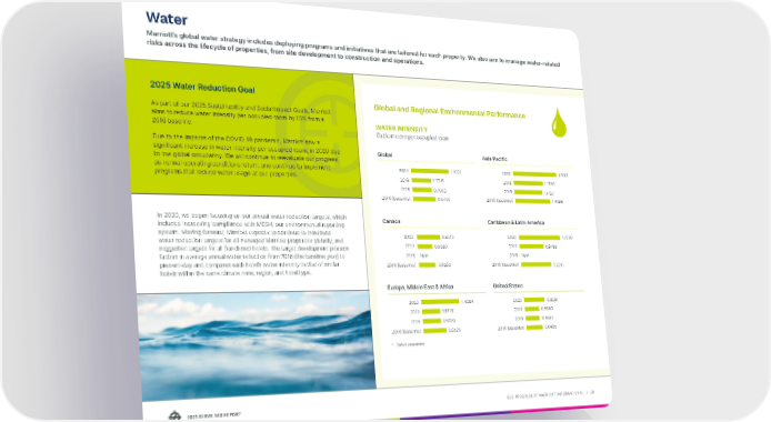 2021 SERVE 360 REPORT ESG PROGRESS AT MARRIOTT INTERNATIONAL → 28 Global and Regional Environmental Performance In 2020, we began focusing on our annual water reduction targets, which included increasing compliance with MESH, our environmental reporting system. Moving forward, Marriott expects to continue to introduce water reduction targets for all managed Marriott properties globally, and suggested targets for all franchised hotels. The target development process factors in average annual water reduction from 2016 (the baseline year) to present-day and compares each hotel’s water intensity to that of similar hotels within the same climate zone, region, and hotel type. 2025 Water Reduction Goal As part of our 2025 Sustainability and Social Impact Goals, Marriott aims to reduce water intensity per occupied room by 15% from a 2016 baseline. Due to the impacts of the COVID-19 pandemic, Marriott saw a significant increase in water intensity per occupied room, in 2020 due to low global occupancy. We will continue to reevaluate our progress, as normal operating conditions return, and continue to implement programs that reduce water usage at our properties. Water Marriott’s global water strategy includes deploying programs and initiatives that are tailored for each property. We also aim to manage water-related risks across the lifecycle of properties, from site development to construction and operations. WATER INTENSITY Cubic meters per occupied room Global 2020 2019 2018 2016 (baseline) 1.1601 0.7015 0.7003 0.8413 Asia Pacific 2020 2019 2018 2016 (baseline) 1.7601 1.1740 1.1727 1.4096 Canada 2020 2019 2018 2016 (baseline) 0.5520 N/A* 0.6265 Caribbean & Latin America 2020 2019 2018 2016 (baseline) 1.7060 0.9793 N/A* 1.2251 Europe, Middle East & Africa 2020 2019 2018 2016 (baseline) 1.4284 0.6718 0.6793 0.8520 United States 2020 2019 2018 2016 (baseline) 0.8391 0.5690 0.5647 0.6495 0.8510 * Data is unavailable .
