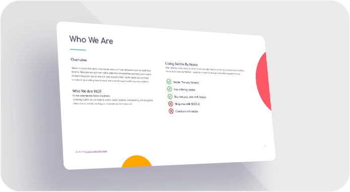 Who We Are Overview Using Sezzle By Name When refering to the company name it should be called ‘Sezzle’ only. Do not use other forms of writing Sezzle is a place that gives more people access to financial freedom and the credit they the name, for example ‘SEZZLE’, ‘sezzle’. Do not use the full legal name unless required to by law. deserve. Shoppers can split their entire order into 4 interest-free payments over 6 weeks. No fees if shoppers pay on time with zero impact to thier credit. Sezzle also promotes businesses by enabling them to reach new users through Sezzle’s payments platform. Sezzle. The way forward. Who We Are NOT Now offering Sezzle. Do not associate the Sezzle brand with: Buy now, pay later with Sezzle. Gambling, overtly sexual material, overtly violent material, overspending, unmanageable debt, criminal activity, banking, or consumers under 18 years old. Shop now with SEZZLE. Checkout with sezzle. Go to the brand assets webpage. 8