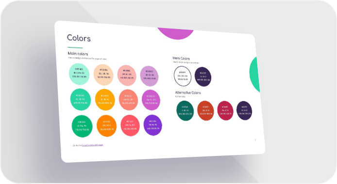 Colors Main colors Hero Colors Use as design anchors or for pops of color. Use for main background and text. #9FF4D9 #FCD7B6 #F9B5B2 #D39BD3 #FFFFFF #382757 159, 244, 217 252, 215, 182 249, 181, 178 211, 151, 211 255, 255, 255 56, 39, 87 33% 0% 23% 0% 1% 17% 28% 0% 0% 35% 20% 0% 16% 44% 0% 0% 0% 0% 0% 0% 88% 94% 35% 30% Alternative Colors #29D3A2 #FEA500 #F98575 #CE5DCB For text only. 41, 211, 162 41, 211, 162 249, 133, 117 206, 93, 203 65% 0% 51% 0% 0% 41% 100% 0% 0% 60% 48% 0% 28% 72% 0% 0% #037269 #D14507 #C12955 #382757 4, 104, 94 203, 60, 10 186, 37, 74 56, 39, 87 88% 38% 63% 22% 14% 89% 100% 4% 20% 98% 63% 7% 88% 94% 35% 30% #00B874 #FF8100 #FF5667 #8333D4 41, 184, 116 255, 129, 0 255, 86, 103 131, 51, 212 77% 0% 75% 0% 0% 61% 100% 0% 0% 81% 48% 0% 64% 81% 0% 0% Go to the brand assets weboage. 7