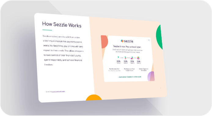 How Sezzle Works Sezzle enables users to split their entire order into 4 interest-free payments over 6 weeks. No fees if they pay on time with zero impact to their credit. This allows shoppers to take control of their financial futures, spend responsibly, and achieve financial freedom. Go to the brand assets webpage. 3