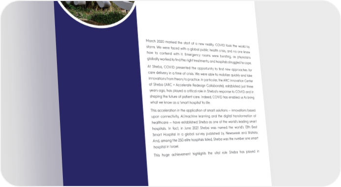 March 2020 marked the start of a new reality. COVID took the world by storm. We were faced with a global public health crisis, and no one knew how to contend with it. Emergency rooms were bursting, as physicians globally worked to 昀椀nd the right treatments, and hospitals struggled to cope. At Sheba, COVID presented the opportunity to 昀椀nd new approaches for care delivery in a time of crisis. We were able to mobilize quickly and take innovations from theory to practice. In particular, the ARC Innovation Center at Sheba (ARC = Accelerate Redesign Collaborate), established just three years ago, has played a critical role in Sheba’s response to COVID and in shaping the future of patient care. Indeed, COVID has enabled us to bring what we know as a ‘smart hospital’ to life. This acceleration in the application of smart solutions — innovations based upon connectivity, AI/machine learning and the digital transformation of healthcare — have established Sheba as one of the world’s leading smart hospitals. In fact, in June 2021 Sheba was named the world’s 13th Best Smart Hospital in a global survey published by Newsweek and Statista. And, among the 250 elite hospitals listed, Sheba was the number one smart hospital in Israel. This huge achievement highlights the vital role Sheba has played in