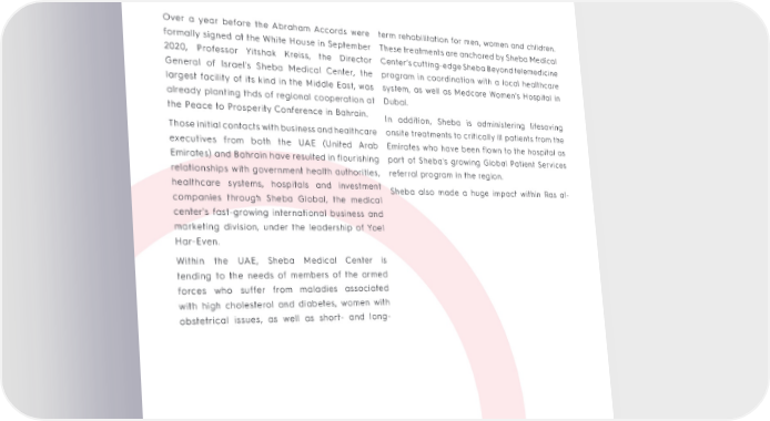 6 Over a year before the Abraham Accords were term rehabilitation for men, women and children. formally signed at the White House in September These treatments are anchored by Sheba Medical 2020, Professor Yitshak Kreiss, the Director Center’s cutting-edge Sheba Beyond telemedicine General of Israel's Sheba Medical Center, the program in coordination with a local healthcare largest facility of its kind in the Middle East, was system, as well as Medcare Women’s Hospital in already planting thds of regional cooperation at Dubai. the Peace to Prosperity Conference in Bahrain. In addition, Sheba is administering lifesaving Those initial contacts with business and healthcare onsite treatments to critically ill patients from the executives from both the UAE (United Arab Emirates who have been flown to the hospital as Emirates) and Bahrain have resulted in flourishing part of Sheba's growing Global Patient Services relationships with government health authorities, referral program in the region. healthcare systems, hospitals and investment Sheba also made a huge impact within Ras al- companies through Sheba Global, the medical syd0 0 10 308.1360.1443 Tm [()-5[(Sheba )9.6 5Lang 5h10 5ade a hg (en-US)/MCID 9 5h10 5ade 0 10 308.1378 center's fast-growing international business and marketing division, under the leadership of Yoel Har-Even. Within the UAE, Sheba Medical Center is tending to the needs of members of the armed forces who suffer from maladies associated with high cholesterol and diabetes, women with obstetrical issues, as well as short- and long-