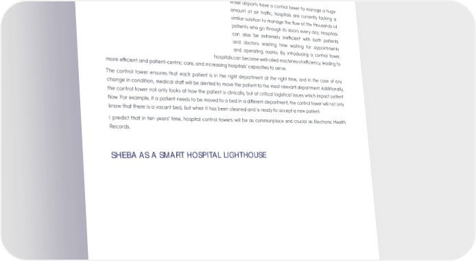 10 CONTROL TOWER TO OPTIMIZE PATIENT FLOWS AND LOGISTICS Not satis昀椀ed with our current position, we are always working hard to 昀椀nd new ways to propel Sheba to be a completely smart hospital. To achieve this, ARC has launched the ‘Control Tower’ project, building a central location to manage all the clinical needs of patients, optimizing patient 昀氀ows as well as logistics. While airports have a control tower to manage a huge amount of air tra昀케c, hospitals are currently lacking a similar solution to manage the 昀氀ow of the thousands of patients who go through its doors every day. Hospitals can also be extremely ine昀케cient with both patients and doctors wasting time waiting for appointments and operating rooms. By introducing a control tower, hospitals can become well-oiled machines of e昀케ciency, leading to more e昀케cient and patient-centric care, and increasing hospitals’ capacities to serve. The control tower ensures that each patient is in the right department at the right time, and in the case of any change in condition, medical sta昀昀 will be alerted to move the patient to the most relevant department. Additionally, the control tower not only looks at how the patient is clinically, but at critical logistical issues which impact patient 昀氀ow. For example, if a patient needs to be moved to a bed in a di昀昀erent department, the control tower will not only know that there is a vacant bed, but when it has been cleaned and is ready to accept a new patient. I predict that in ten years’ time, hospital control towers will be as commonplace and crucial as Electronic Health Records. SHEBA AS A SMART HOSPITAL LIGHTHOUSE