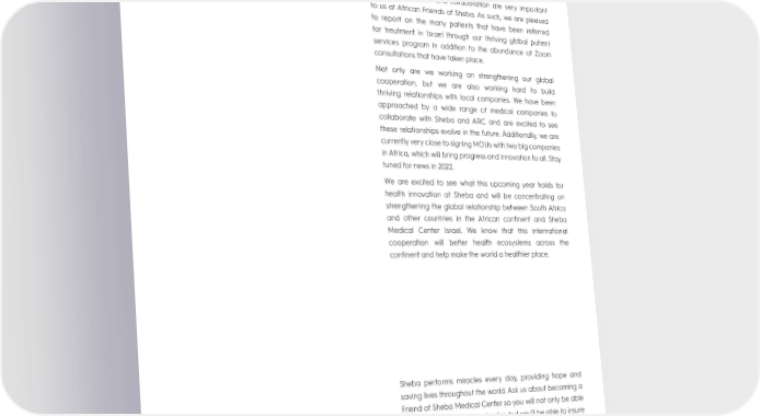 Global cooperation and collaboration are very important to us at African Friends of Sheba. As such, we are pleased to report on the many patients that have been referred for treatment in Israel through our thriving global patient services program in addition to the abundance of Zoom consultations that have taken place. Not only are we working on strengthening our global cooperation, but we are also working hard to build thriving relationships with local companies. We have been approached by a wide range of medical companies to collaborate with Sheba and ARC and are excited to see these relationships evolve in the future. Additionally, we are currently very close to signing MOUs with two big companies in Africa, which will bring progress and innovation to all. Stay tuned for news in 2022. We are excited to see what this upcoming year holds for health innovation at Sheba and will be concentrating on strengthening the global relationship between South Africa and other countries in the African continent and Sheba Medical Center Israel. We know that this international cooperation will better health ecosystems across the continent and help make the world a healthier place. Sheba performs miracles every day, providing hope and saving lives throughout the world. Ask us about becoming a Friend of Sheba Medical Center so you will not only be able contribute to these daily miracles, but you’ll be able to insure you and your loved ones in your time of need. For more information about our work or how to become a Friend of Sheba, please visit our website: www.africanfriendsofsheba.org or our Facebook Page. You can contact Naomi