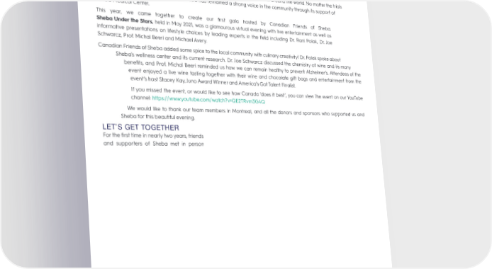 This past year has proven to be one of the biggest challenges we had to face all around the world. No matter the trials and tribulations, Canadian Friends of Sheba has remained a strong voice in the community through its support of Sheba Medical Center. This year, we came together to create our 昀椀rst gala hosted by Canadian Friends of Sheba. Sheba Under the Stars, held in May 2021, was a glamourous virtual evening with live entertainment as well as informative presentations on lifestyle choices by leading experts in the 昀椀eld including Dr. Rani Polak, Dr. Joe Schwarcz, Prof. Michal Beeri and Michael Avery. Canadian Friends of Sheba added some spice to the local community with culinary creativity! Dr. Polak spoke about Sheba’s wellness center and its current research. Dr. Joe Schwarcz discussed the chemistry of wine and its many bene昀椀ts, and Prof. Michal Beeri reminded us how we can remain healthy to prevent Alzheimer’s. Attendees of the event enjoyed a live wine tasting together with their wine and chocolate gift bags and entertainment from the event’s host Stacey Kay, Juno Award Winner and America’s Got Talent Finalist. If you missed the event, or would like to see how Canada ‘does it best’, you can view the event on our YouTube channel: https://www.youtube.com/watch?v=QE2TRvm3G4Q We would like to thank our team members in Montreal, and all the donors and sponsors who supported us and Sheba for this beautiful evening. LET’S GET TOGETHER For the 昀椀rst time in nearly two years, friends and supporters of Sheba met in person