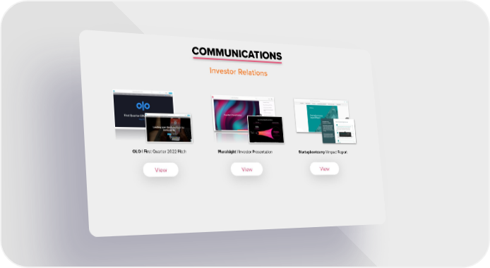 COMMUNICATIONS Investor Relations bp | Analyst Day PresentationOLO | First Quarter 2022 Pitch Pluralsight | Investor Presentation Startupbootcamp | Impact Report View View View Brand & Reputation Showcase Page 16 Page 18