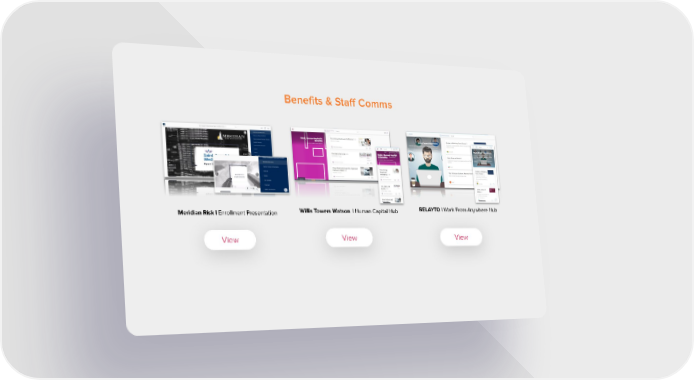 Benefits & Staff Comms RELAYTO | Work From Anywhere Hub Willis Towers Watson | Human Capital Hub Meridian Risk | Enrollment Presentation View View View Showcase Page 18 Page 20