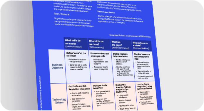 A proven skills transformation partner Key Di昀昀erentiators An End-to-End Solutio渀 Automation of Workforce Plannin最 SkyHive's technology enables each step in Static or one-time workforce planning is no longer a workforce transformation, from relevant or e昀昀ective. SkyHive delivers “Continuous monitoring skill trends in the external labor workforce planning" solutions, as recognized by Gartner⸀ market, to capturing internal skills data at the organizational and individual level⸀ Platform as a Servic攀 Open / Ethical AI SkyHive o昀昀ers an extensible architecture/infrastructure along with APls that support the development of external SkyHive has undergone substantial third- applications on top of its engine. party due diligence and is a recognized leader in ethical Al for people technologies. Expanded Rollout to Complement HCM Strategy What skills do What skills do What are What actions do we need㼀 we have㼀 the gaps㼀 we take㼀 (Job Architecture) (Skills Inventory) (Workforce Strategy) (Employee Reskilling) De昀椀ne ‘work' at the Understand current Enable strategic Mobilize & execute skill level employee skills talent decisions workforce plan in Y Establish foundation Y Understand Y Develop intelligence - HCM for gap analysiU organization’s skills informed talent Y Optimize & create Business Y Generate job to skills blueprin} strateg° sustainable skill- mapping; de昀椀ne new Y Accelerate time to Y Identify workforce based practices in Objective roles as needed value for key roles skill gaps through HCMæ labor market insight Y Targeted training to on future trends, bridge skill gapsæ .ai skills, and adjacencies e Y Increase engagement with key skills .skyhiv Job Pro昀椀le and Jo戀 Employee Pro昀椀le SkyHive UI or Learning Course | www Requisition Integration Integration Analytics Platform Integration (+ other ed. Y Auto generate and Integration (via systems as needed) Y Job-to-skill mapping maintain skill SkyHive APIs) automationæ Y Career paths & pro昀椀les æ Y Labor market mentorshipsæ ts Reserv Technology Y Job description Y Augment skills Intelligenceæ Drivers generatoræ Y Opportunity Graph pro昀椀les with labor Y Position Supply/ skill requirementsæ All Righ Y Embed in talent market recommended Demandæ Y Training-to-skill . mgmt. and talent acq. skills mapping automation Inc processes Y Workforce Planningæ Y Buy strategy leans on adjacent roles Impact Full identi昀椀cation of Automated, real-time Data-driven plan to Business value the workforce's skill visibility into close skill gaps (build, realized from skills echnologies Holdings,Delivered requirements workforce skills buy, or borrow) transformation T e 3 SkyHiv © 202 04