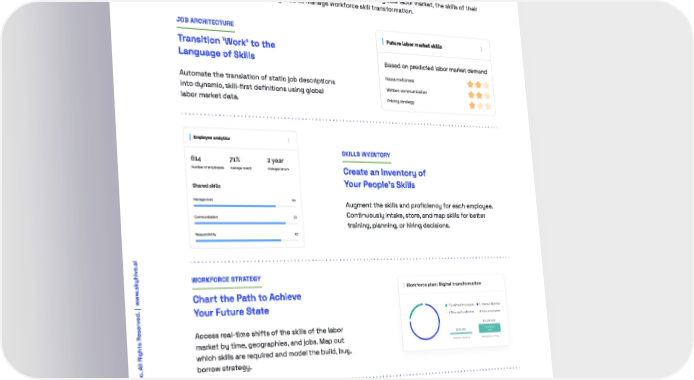 SkyHive Enterprise The end-to-end solution for transitioning from job-based to skill-based This skills-昀椀rst applications suite provides a 360-degree view into the global labor market, the skills of their workforce, and a system of intelligence to manage workforce skill transformation. JOB ARCHITECTURE Future labor market skills Transition ‘Work' to the Language of Skills Based on predicted labor market demand Resourcefulness Automate the translation of static job descriptions Written communication into dynamic, skill-昀椀rst de昀椀nitions using global Pricing strategy labor market data. Employee analytics SKILLS INVENTORY 614 71% 2 year Number of employees Average match Average tenure Create an Inventory of Shared skills Your People's Skills Management 60 Augment the skills and pro昀椀ciency for each employee. Communication 70 Continuously intake, store, and map skills for be琀琀er training, planning, or hiring decisions. Responsibility 67 .ai e .skyhiv WORKFORCE STRATEGY | www Chart the Path to Achieve ed. Your Future State ts Reserv Access real-time shifts of the skills of the labor market by time, geographies, and jobs. Map out All Righ which skills are required and model the build, buy, . Inc borrow strategy. Skills gaps training EMPLOYEE RESKILLING Managing and projecting your business 昀椀nances echnologies Holdings, Continuously Build Business Critical Skills T Covered skills e Customer experience management IT management Bring laser focus to L&D investment, time investment, 3 SkyHiv Project team management and career impact for the employee experience. © 202 05