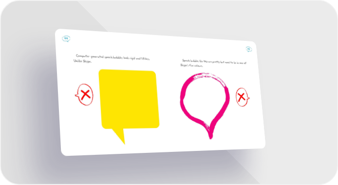 Skype Brand Book Page 22 Page 2444 45 Computer generated speech bubbles look rigid and lifeless. Speech bubbles like this are pretty but need to be in one of Unlike Skype. Skype’s five colours.